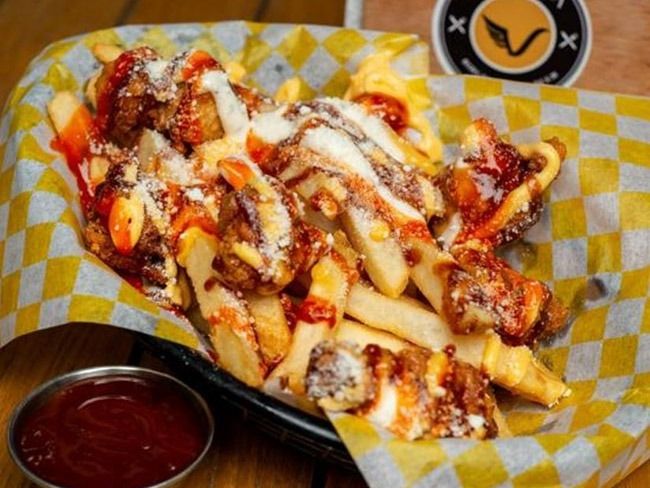 200Grs carne con aros de cebolla, papas a la francesa, dedos de queso bañada en salsa bbq y búfalo.