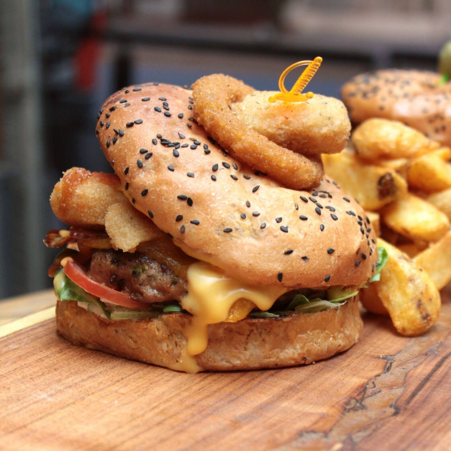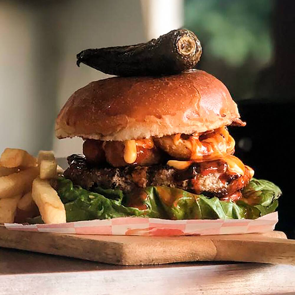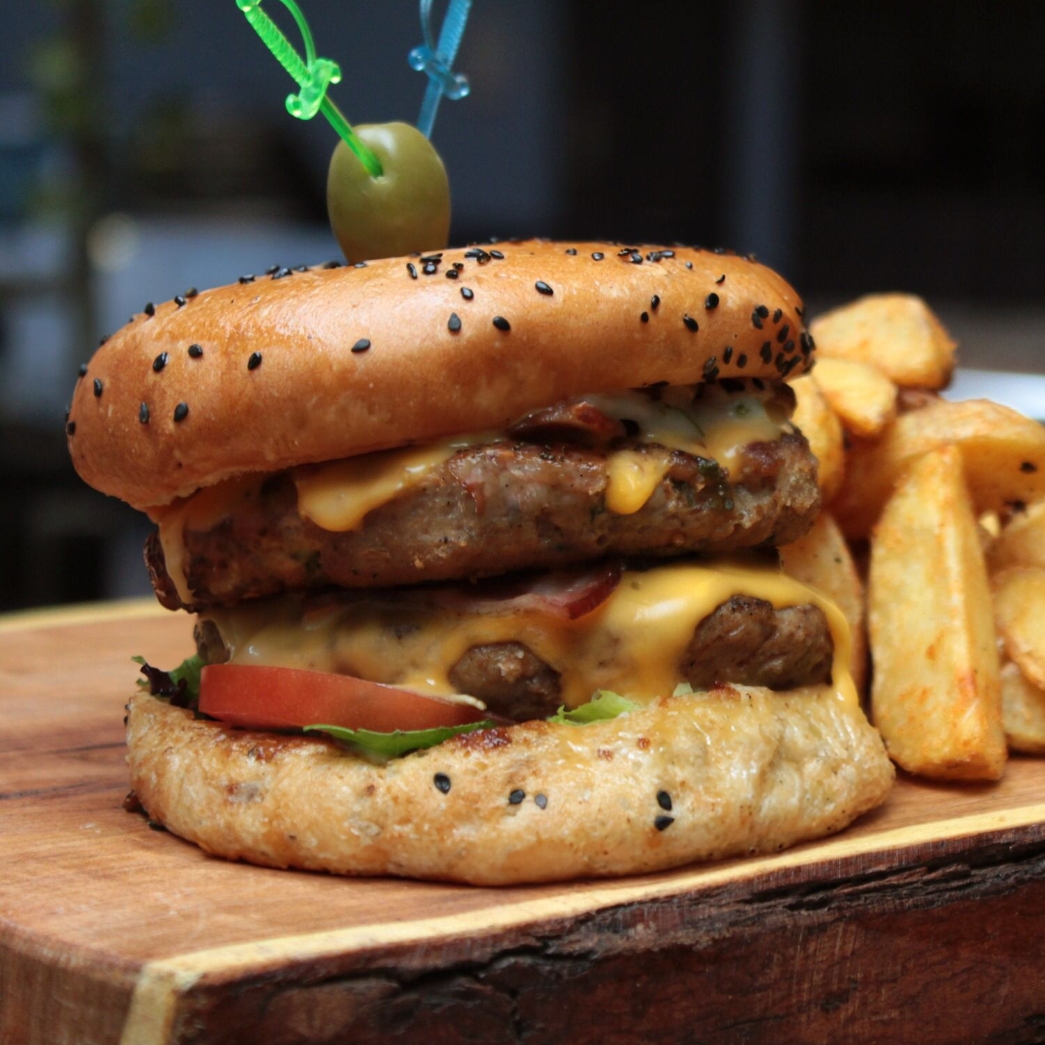 200Grs de carne con tomate, papas a la francesa, ranch, lechuga, tocino, queso amarillo y el toque de la casa.