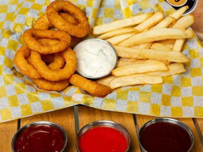 Aros de cebolla con 6 piezas y papas.