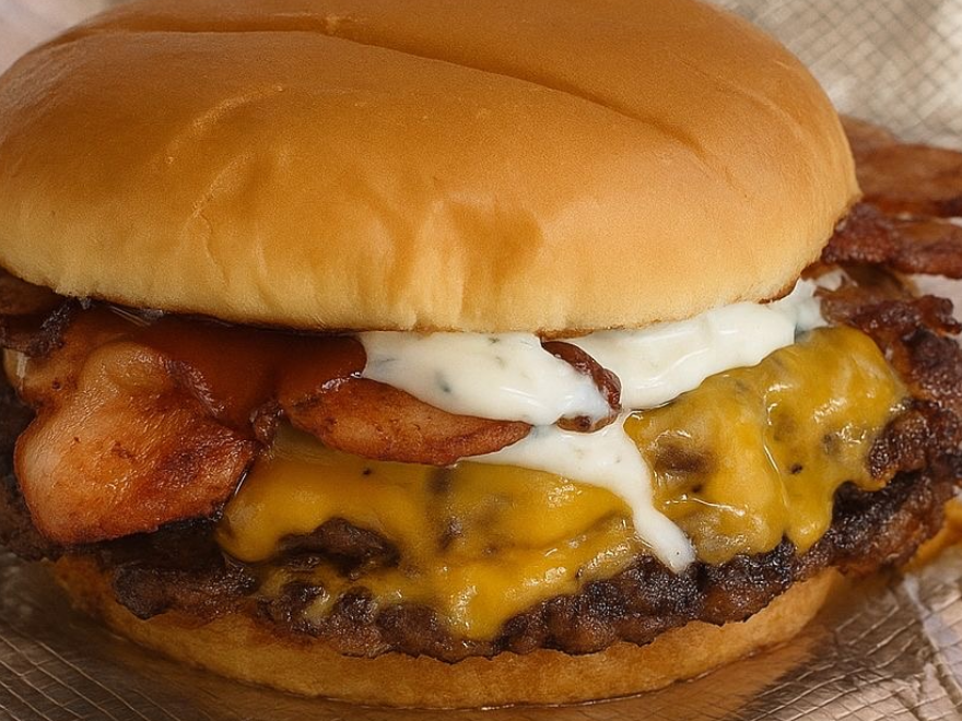 DOBLE BEEF PATTY - TOCINO - BBQ - QUESO CHEDDAR - CEBOLLA - ADEREZO WALLACE