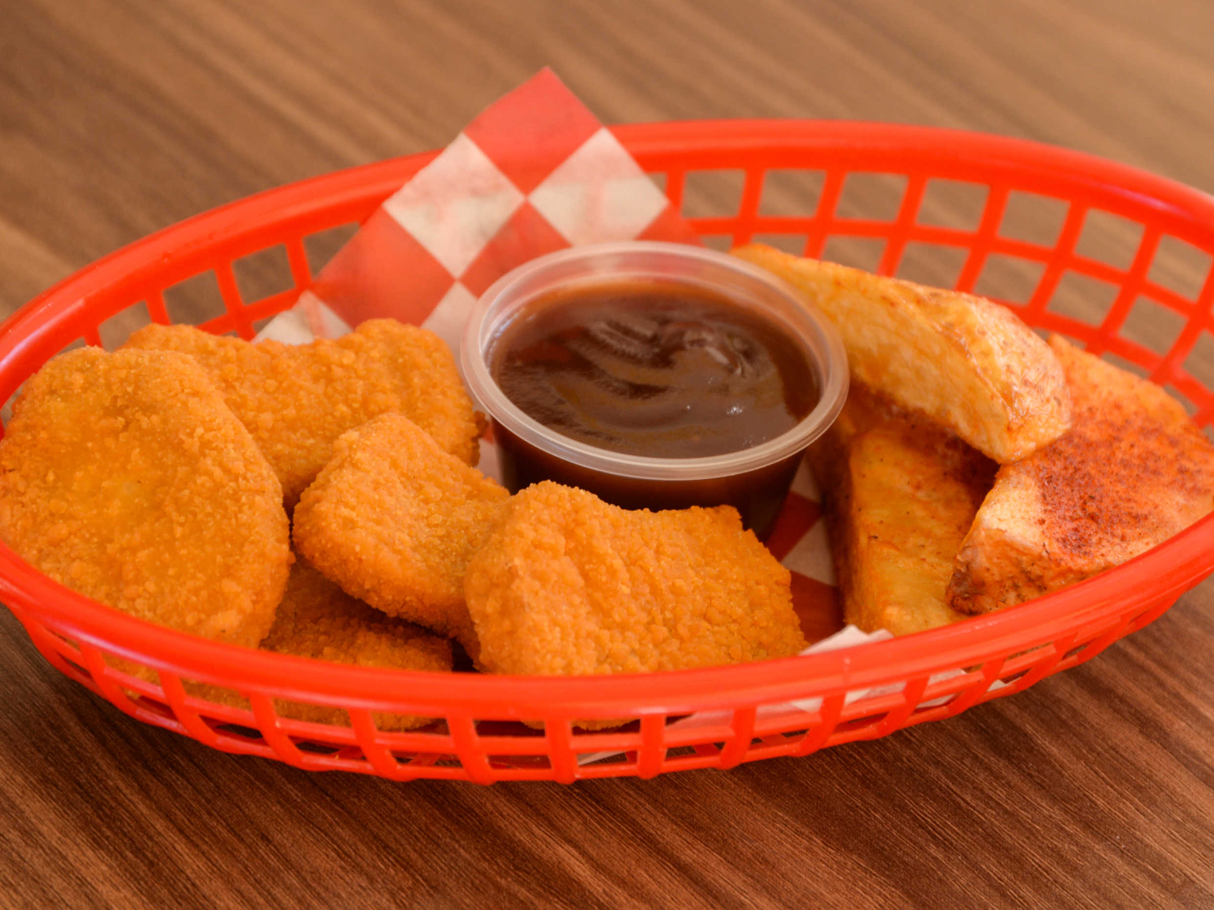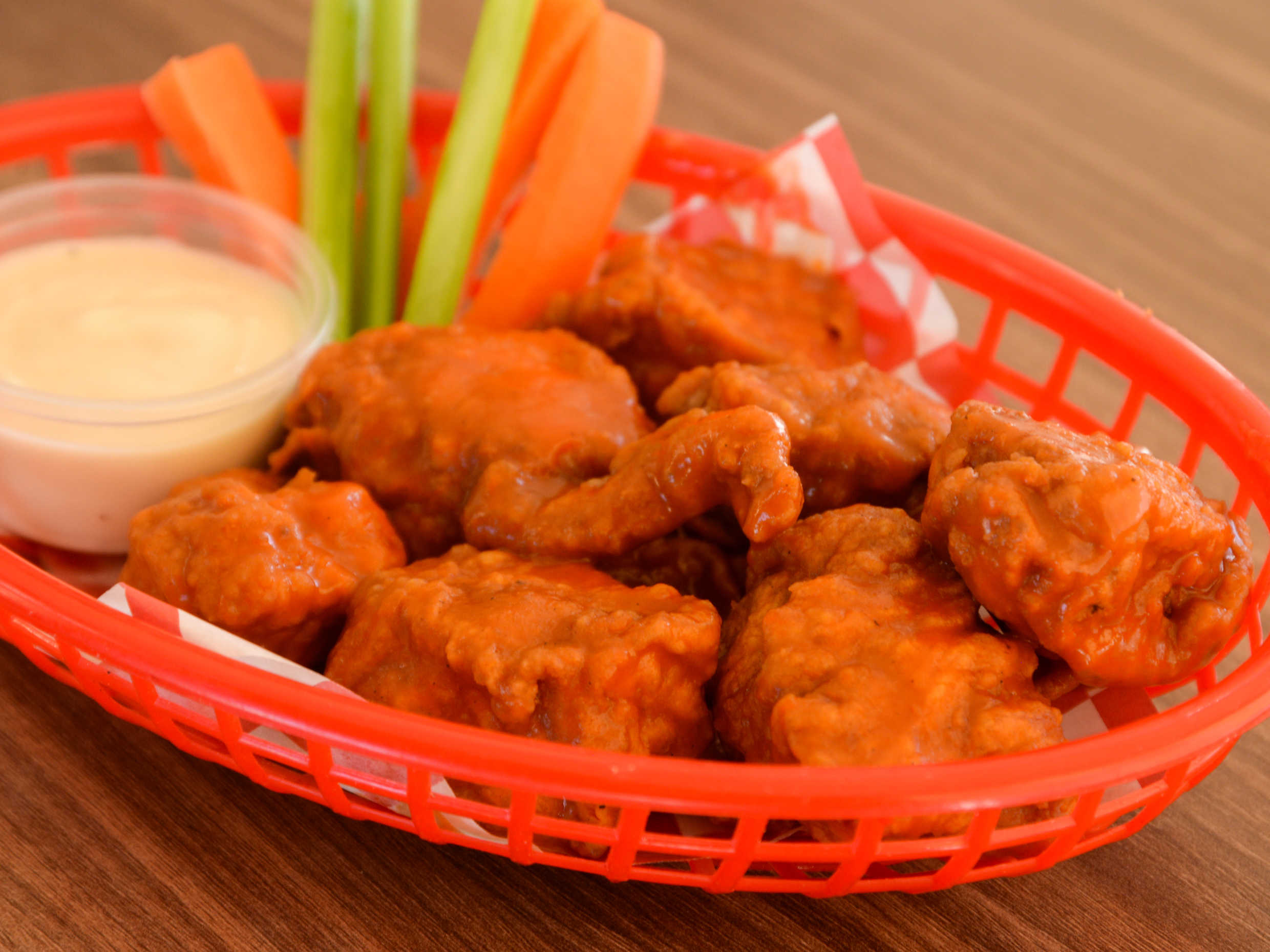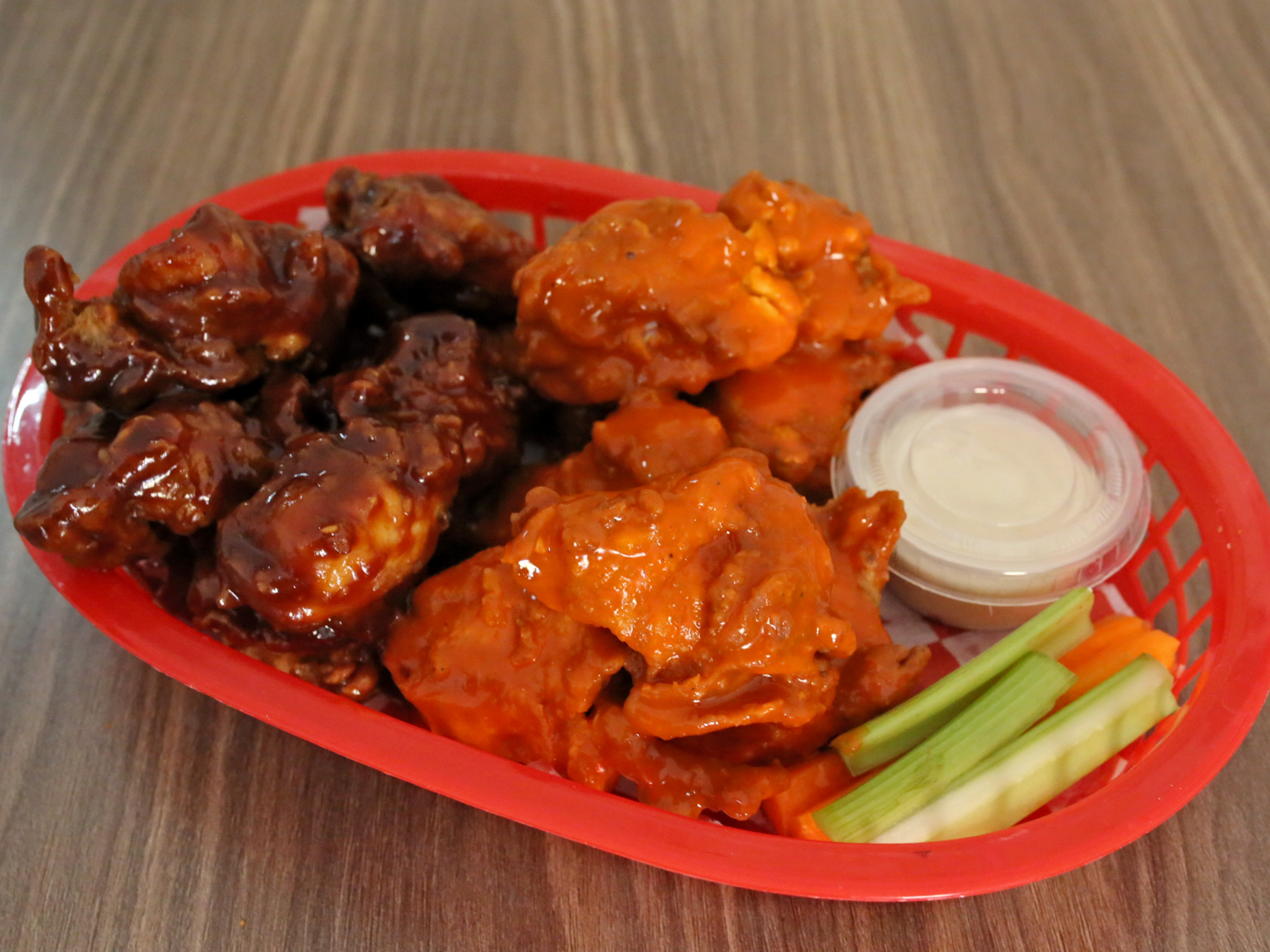 Trocitos de pechuga de pollo sazonados, bañados en nuestras salsas, acompañadas de vegetales y ranch.