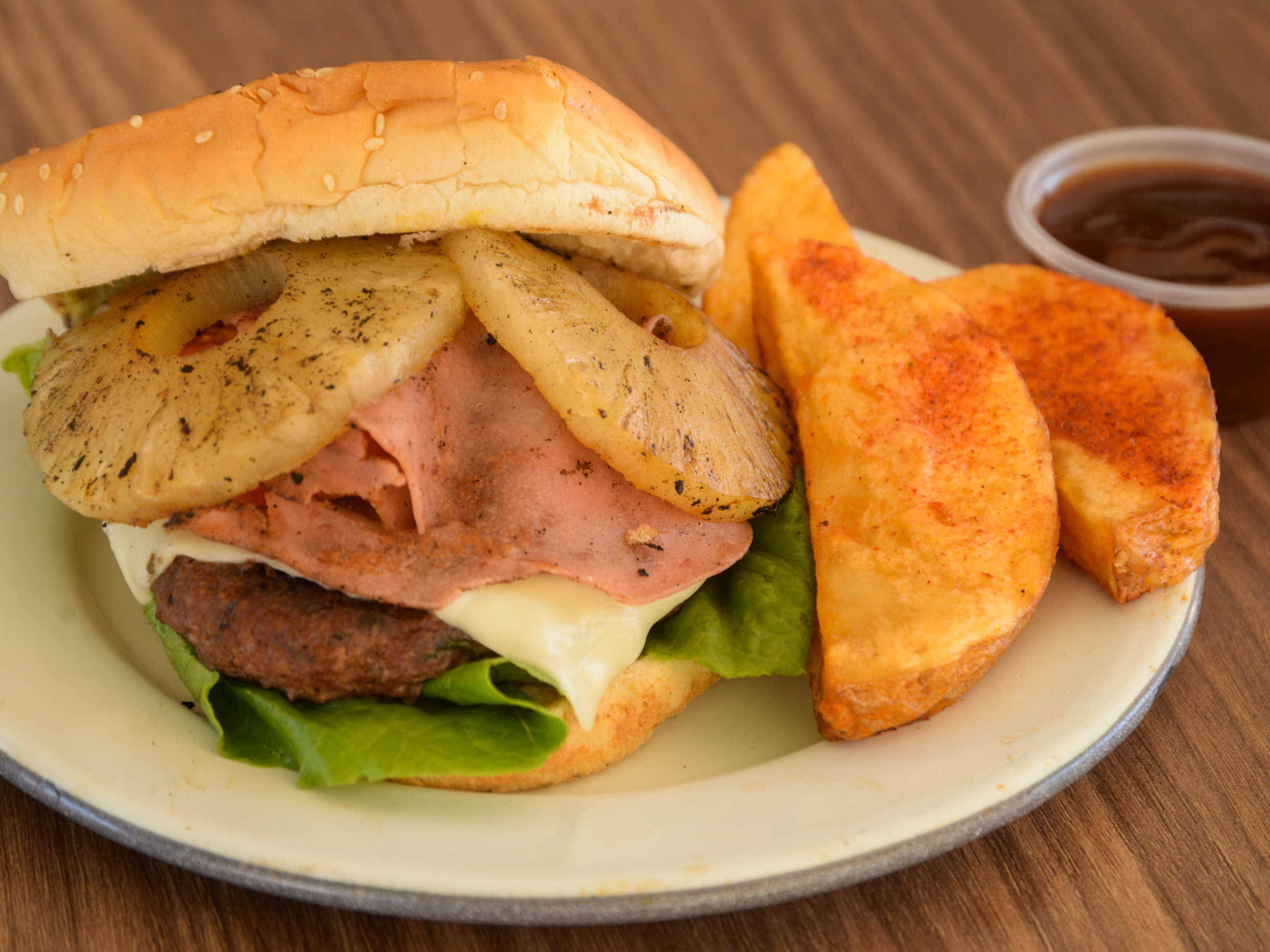 Jugosa carne de res, especialmente sazonada, queso manchego, cebolla caramelizada, tocino, rebanada de piña y jamón acompañado de papas gajo.