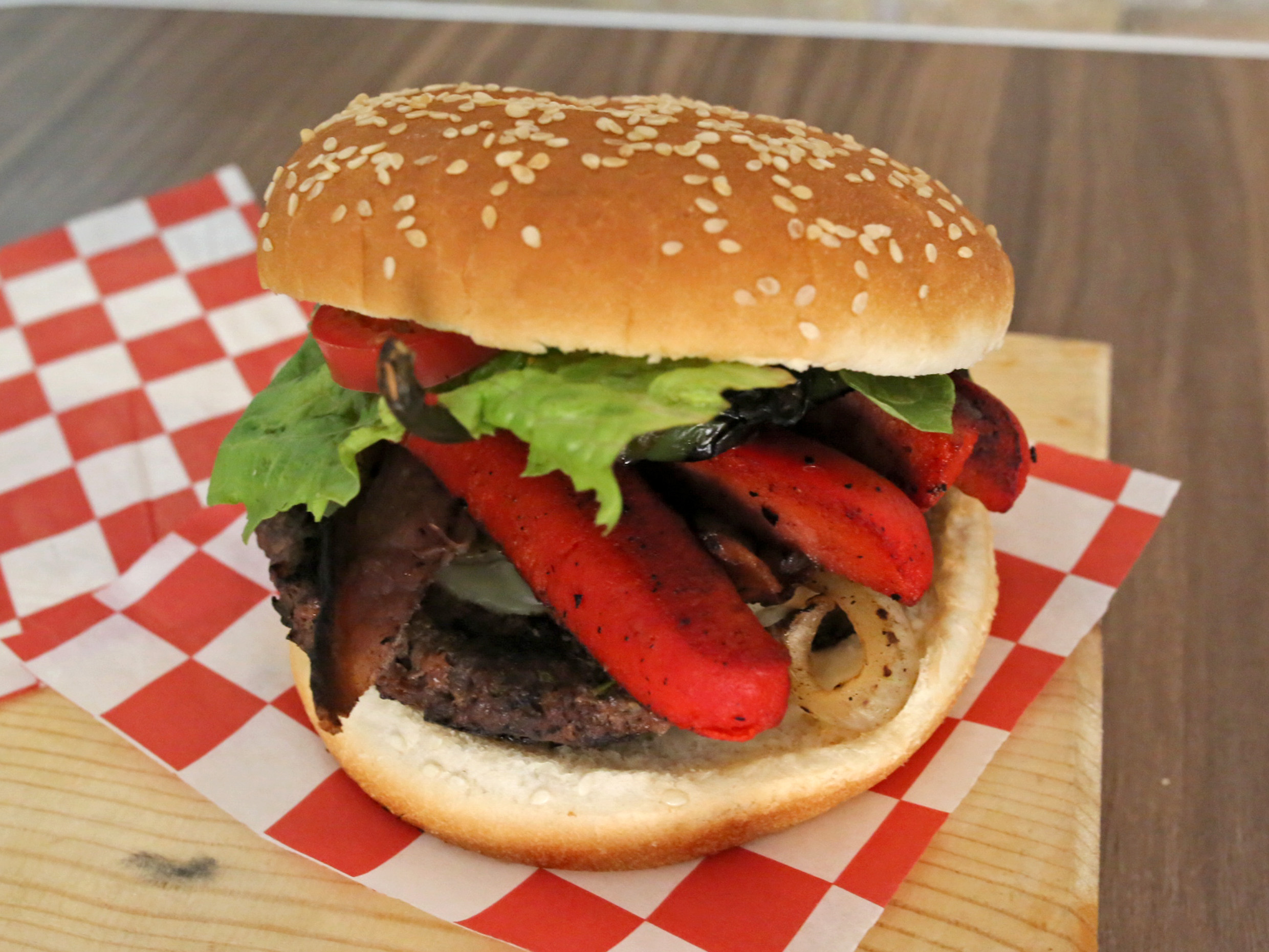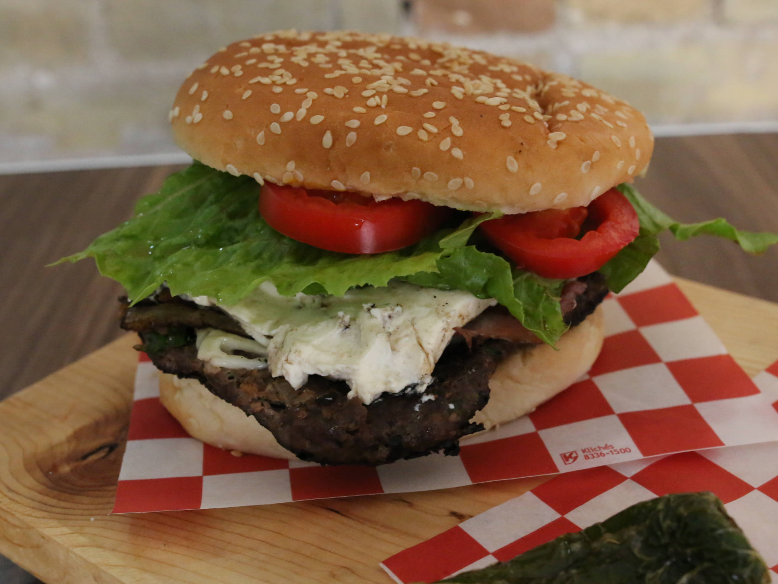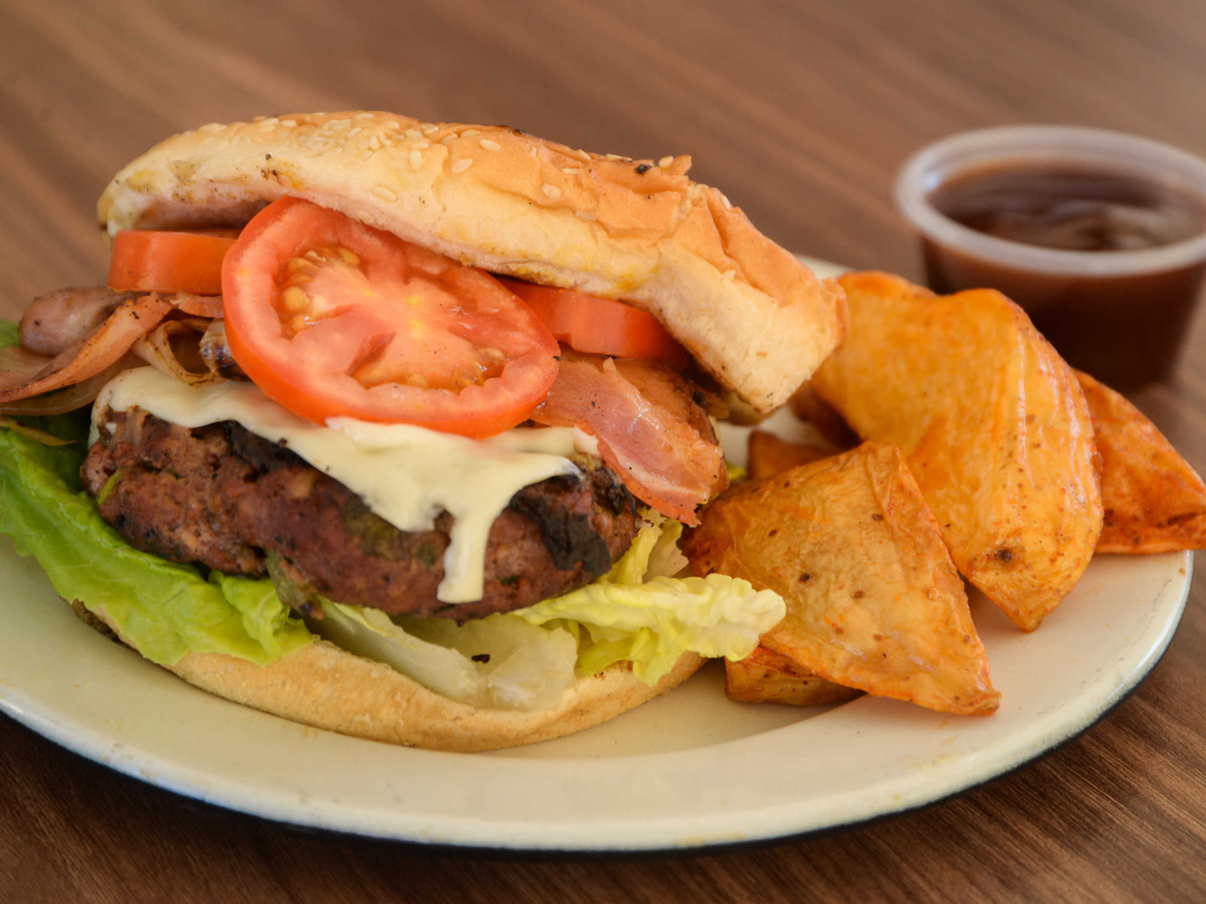 Jugosa carne de res, hecha en casa, queso manchego, cebolla asada y tocino acompañado de papas gajo.