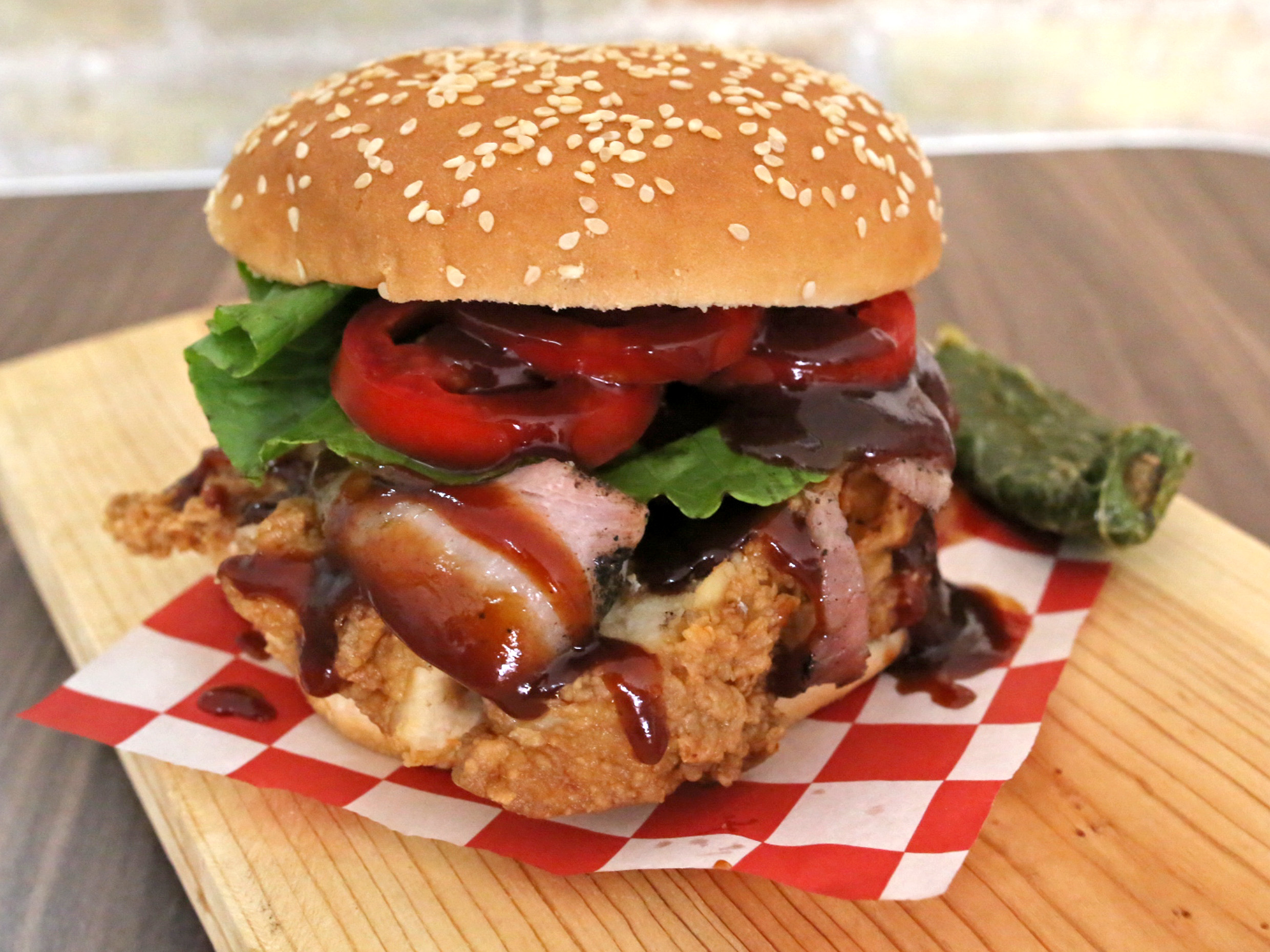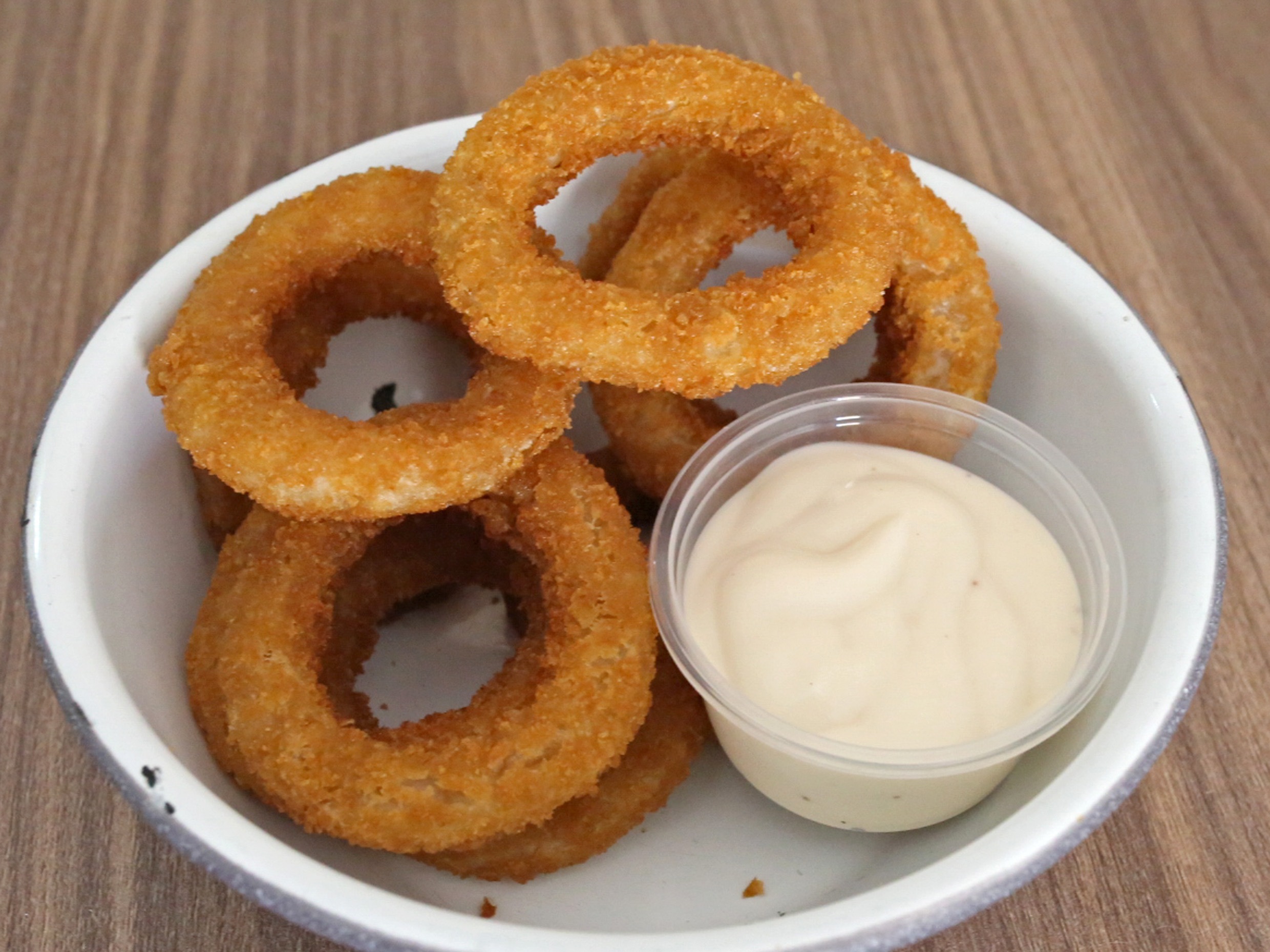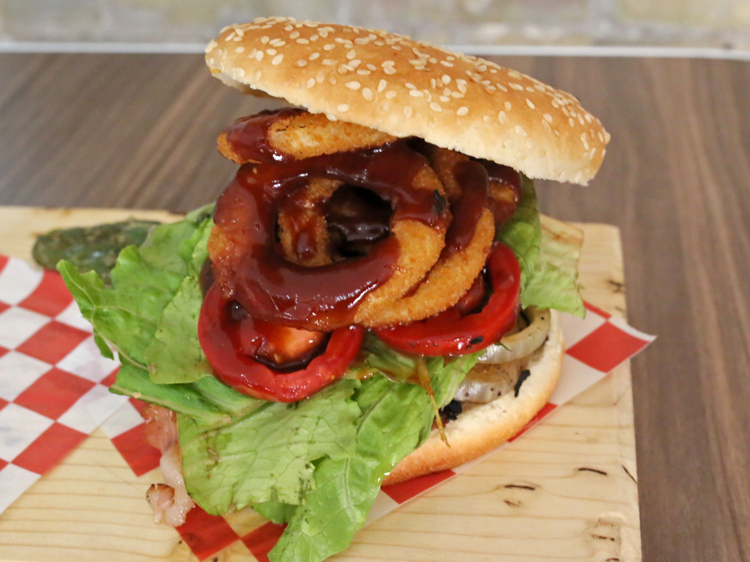 Jugosa carne de res, especialmente sazonada, queso manchego, cebolla caramelizada, tocino, aros de cebolla, bañada en salsa BBQ acompañado de papas gajo.