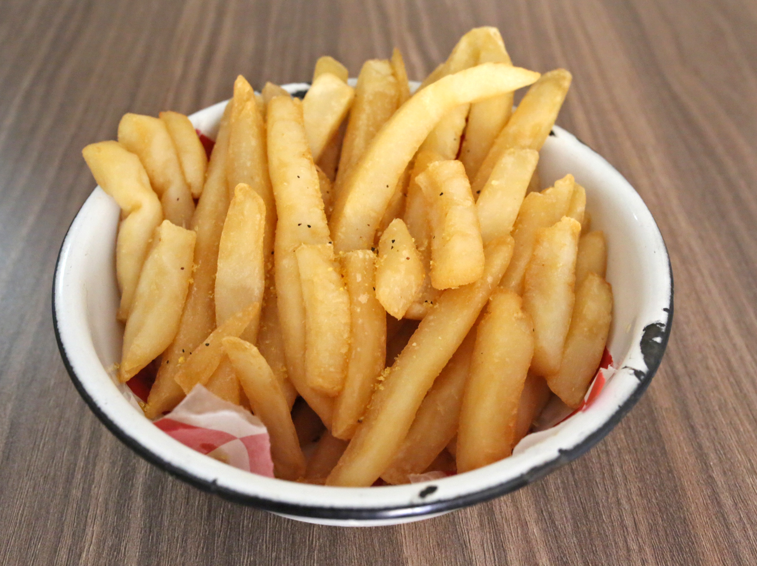 Jugosa carne de res hecha en casa, queso manchego, acompañado de papas a la francesa y jugo.