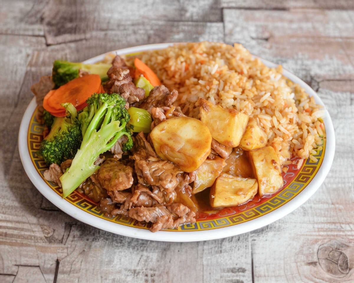 1 guisado con arroz (500 g), acompañado de zanahoria o pasta (500 g) con repollo. Porción personal.
