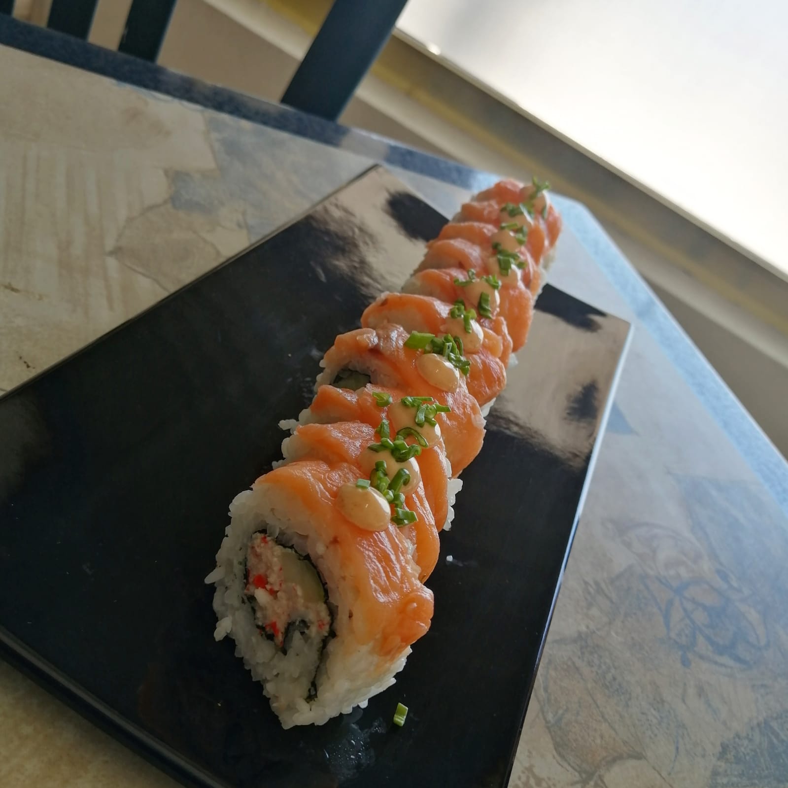 Por dentro surimi, queso crema, por fuera salmón y aguacate.
