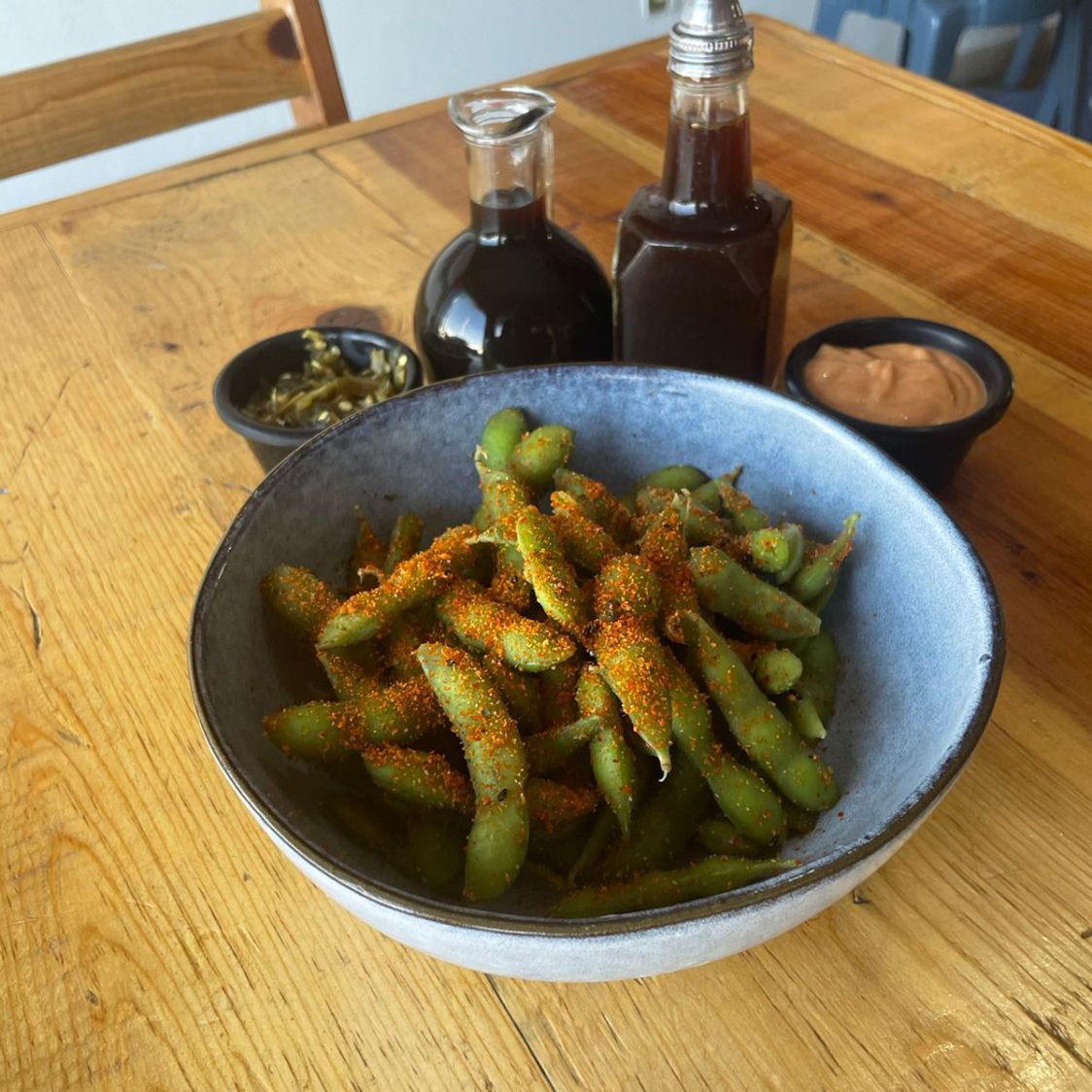 Vainas de soja, bañadas en limón, sal de grano y togarashi.