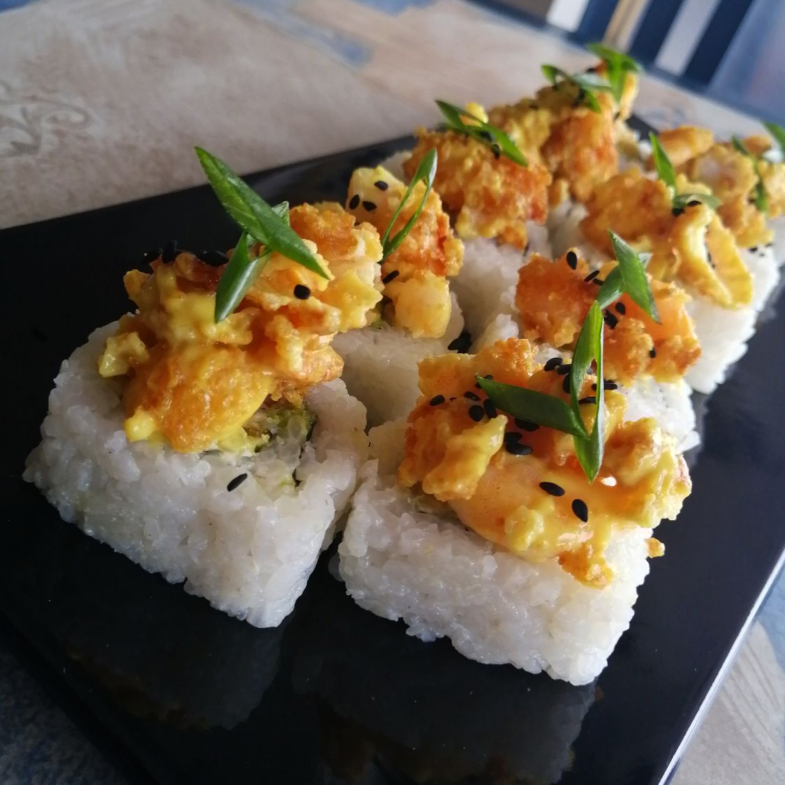 Por dentro aguacate, queso crema, pepino, por fuera camarón tempura bañados en salsa spicy.