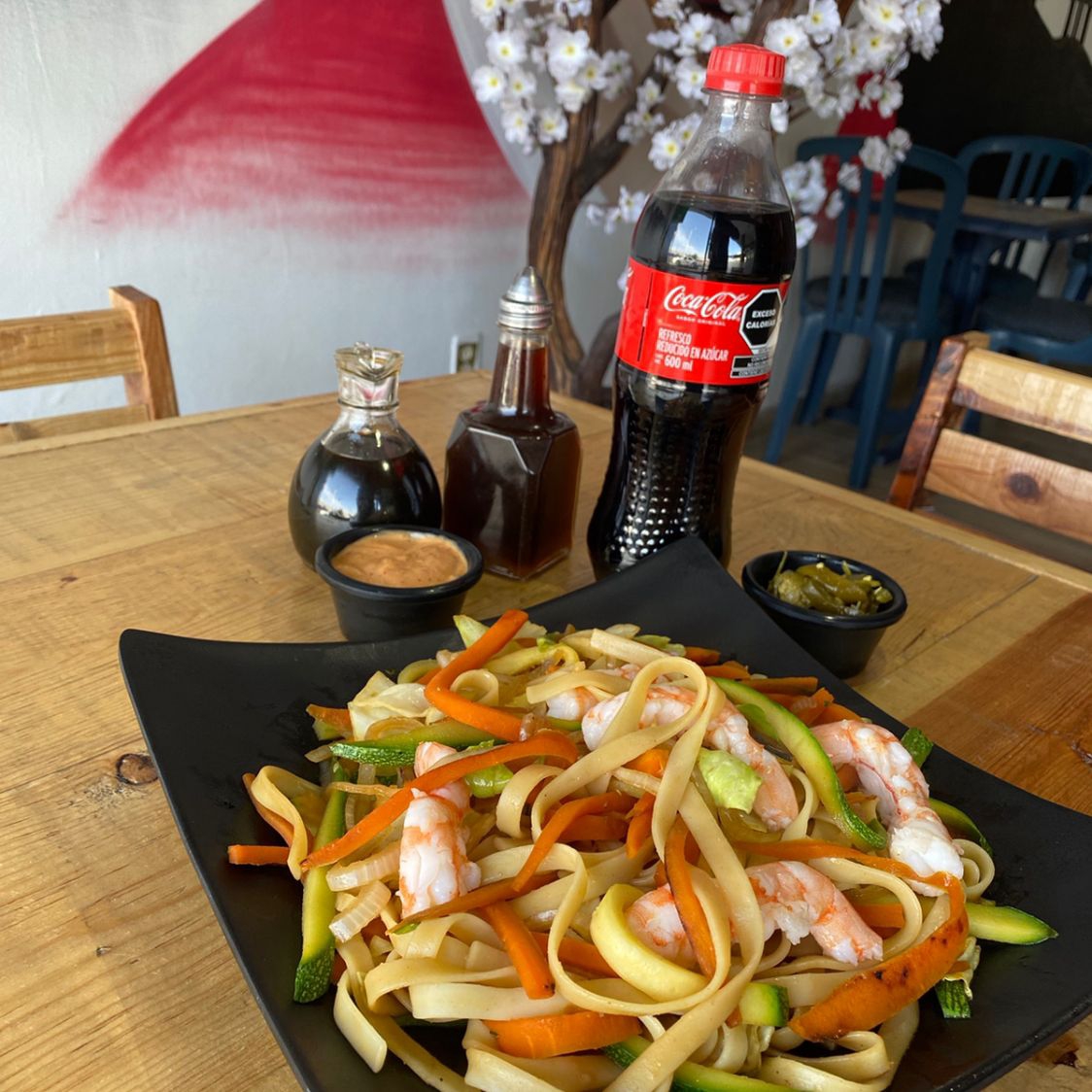 Fideos acompañados de verdura zanahoria, calabaza, champiñón, brócoli y camarón.