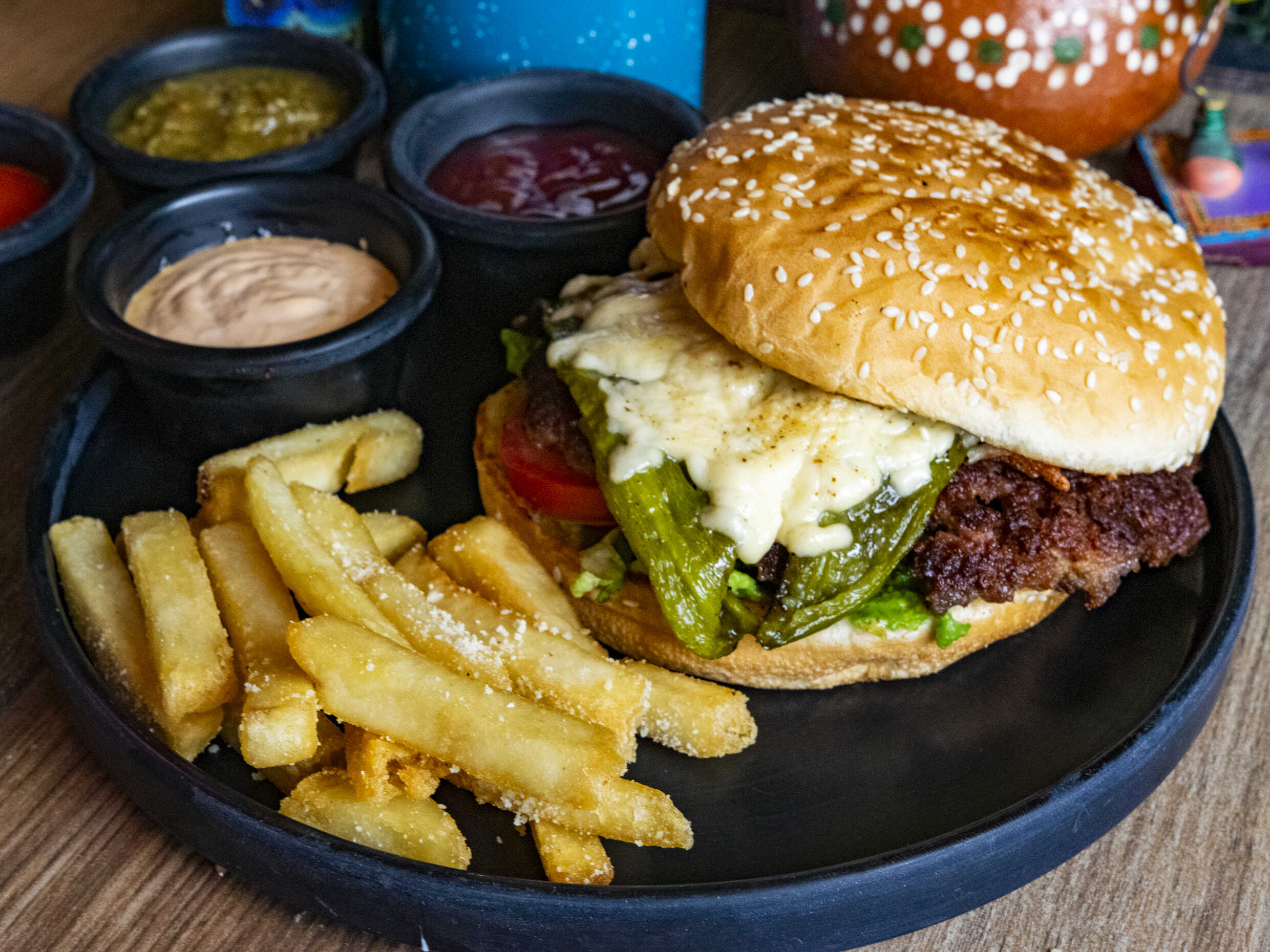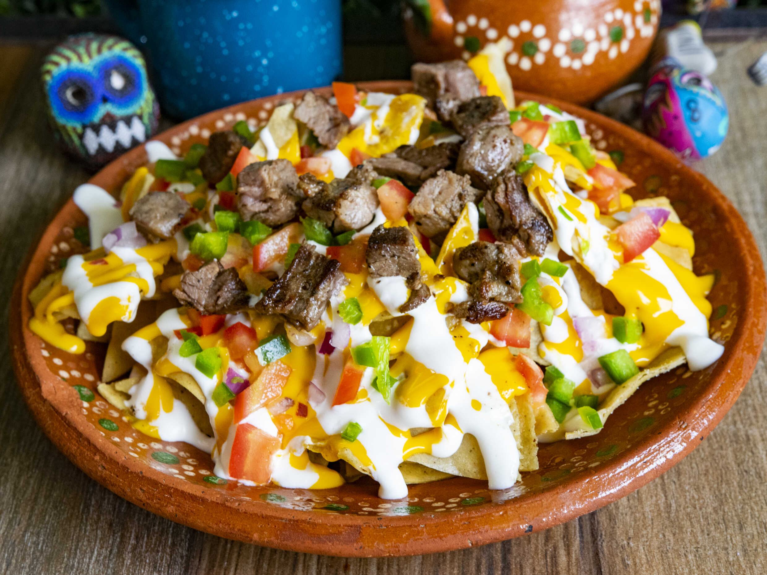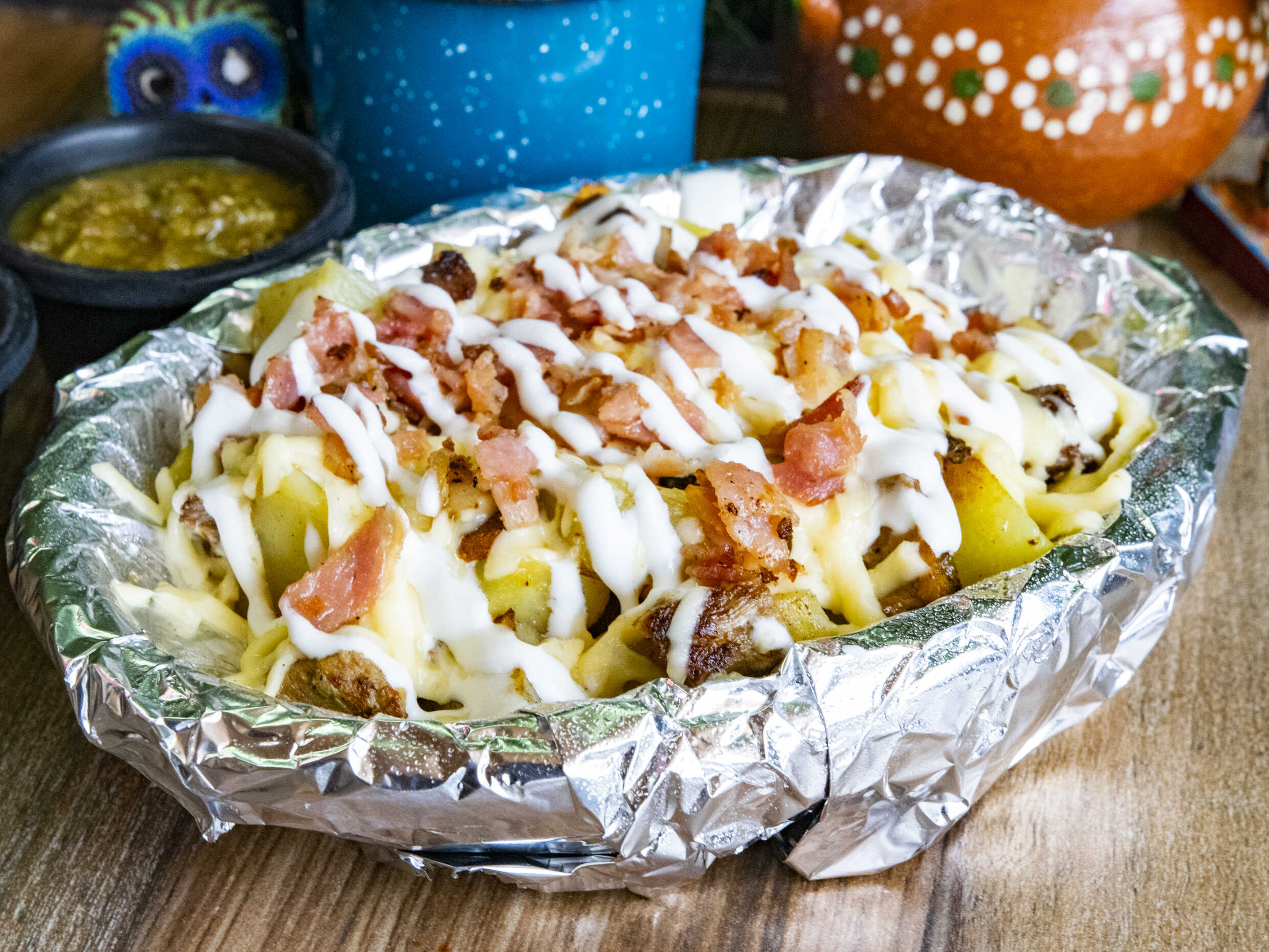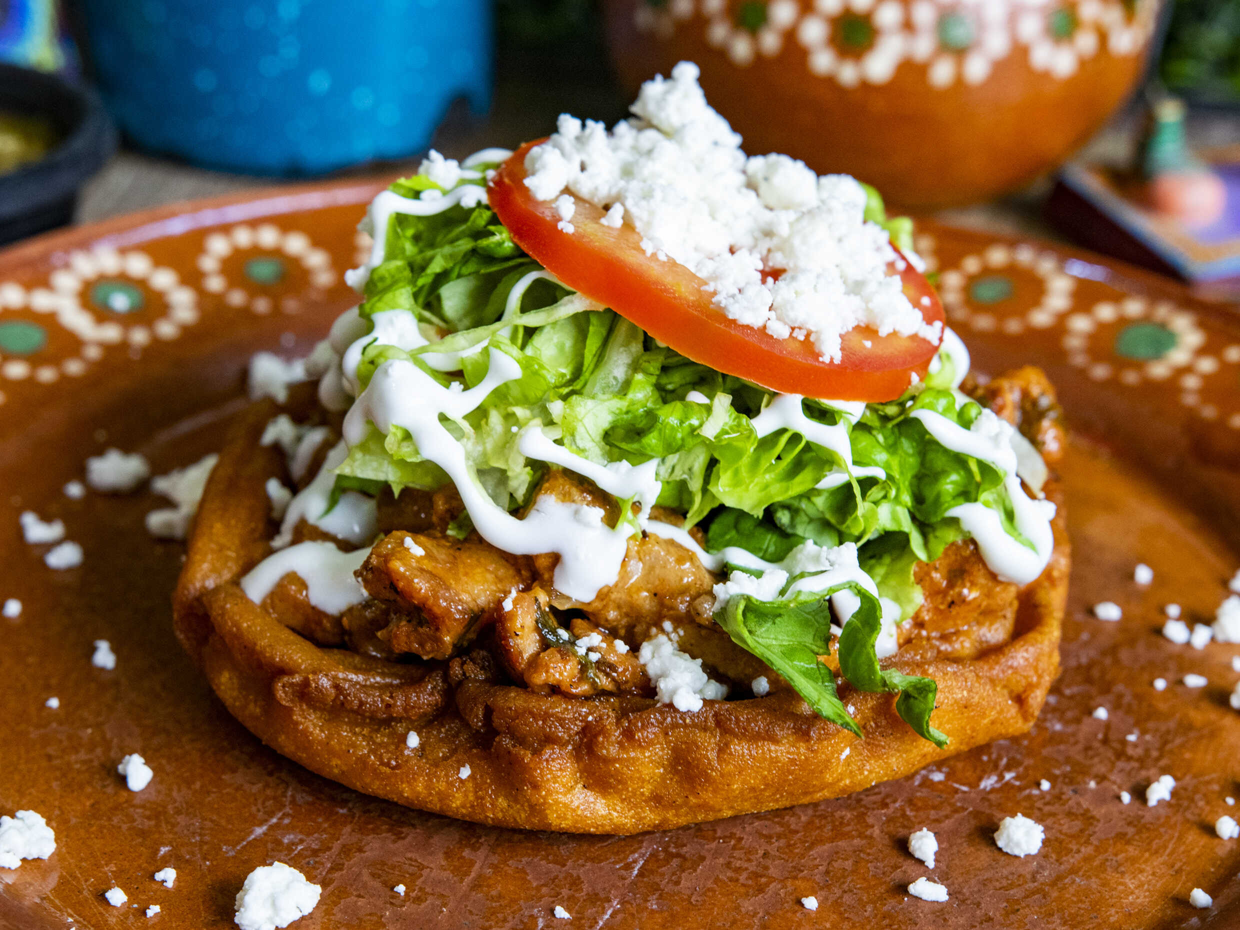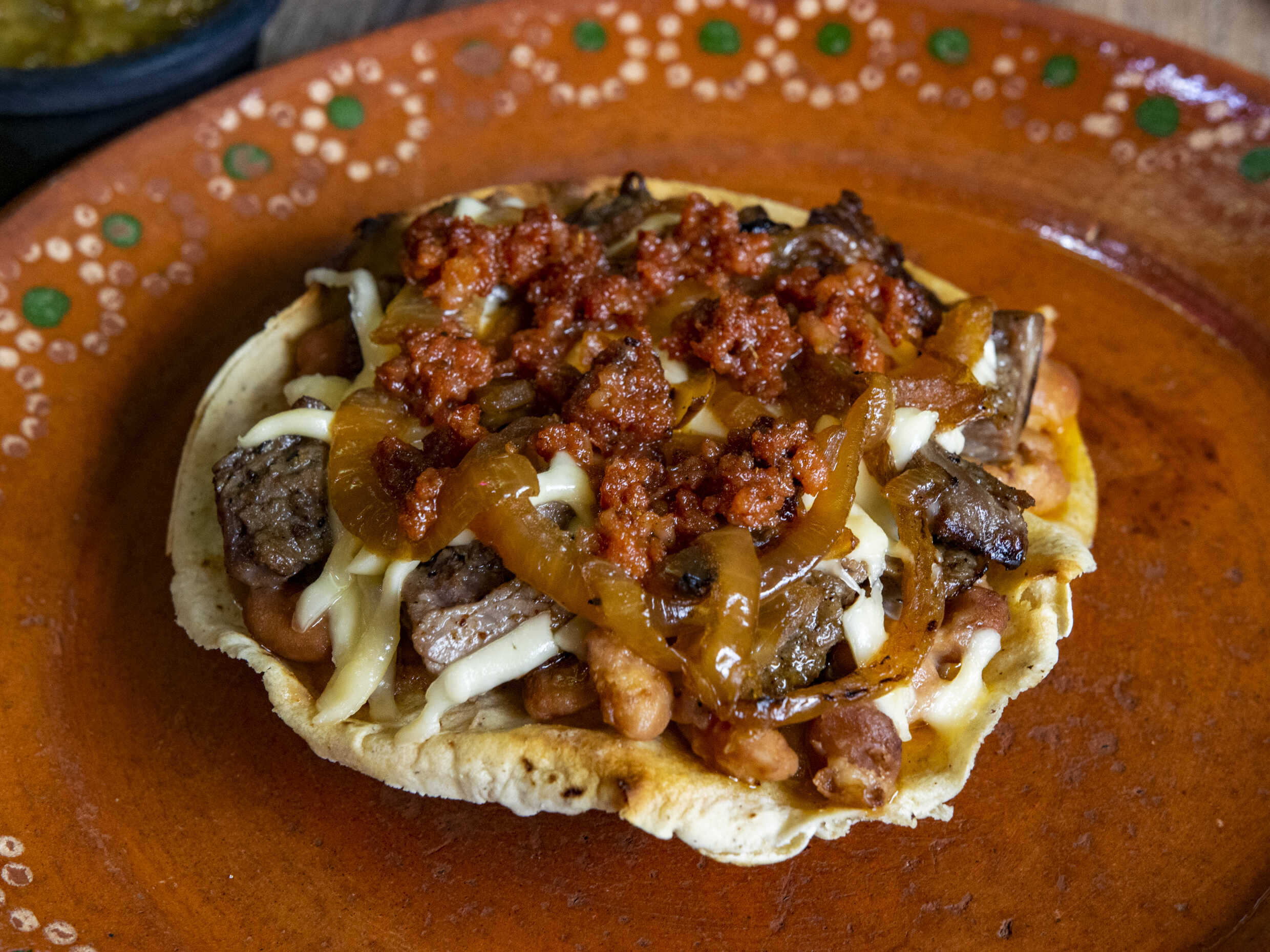 Bombita clásica con frijoles puercos, cebolla asada, chorizo ranchero, arrachera, queso Chihuahua en tostada de maíz.
