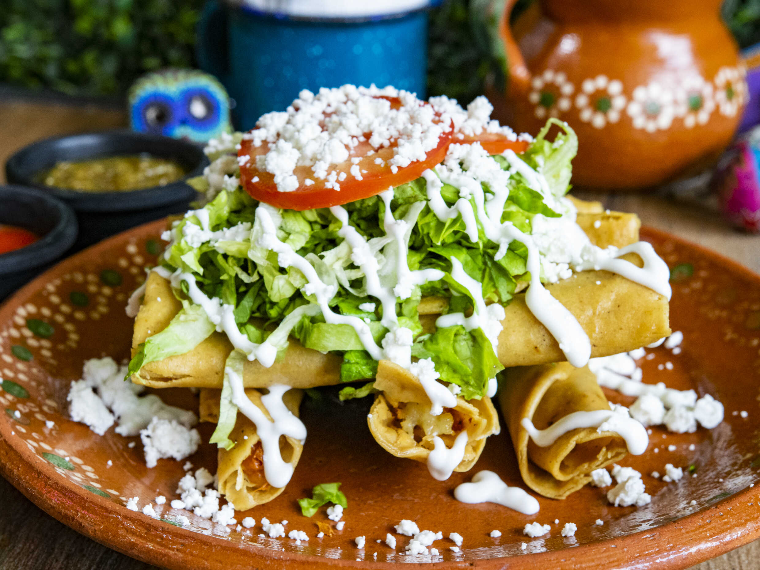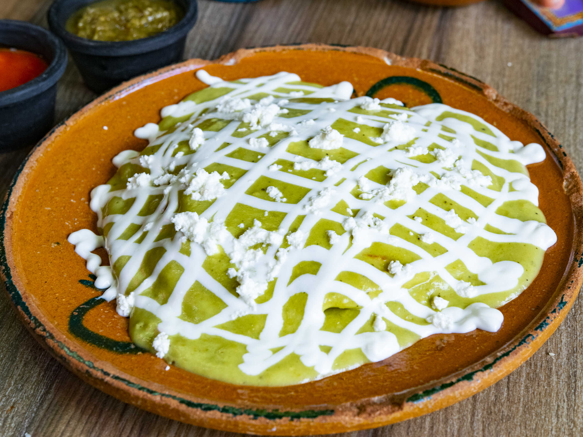 Quesadilla de tortilla de harina con frijoles puercos, arrachera, crema, queso Chihuahua y salsa verde de barrio.