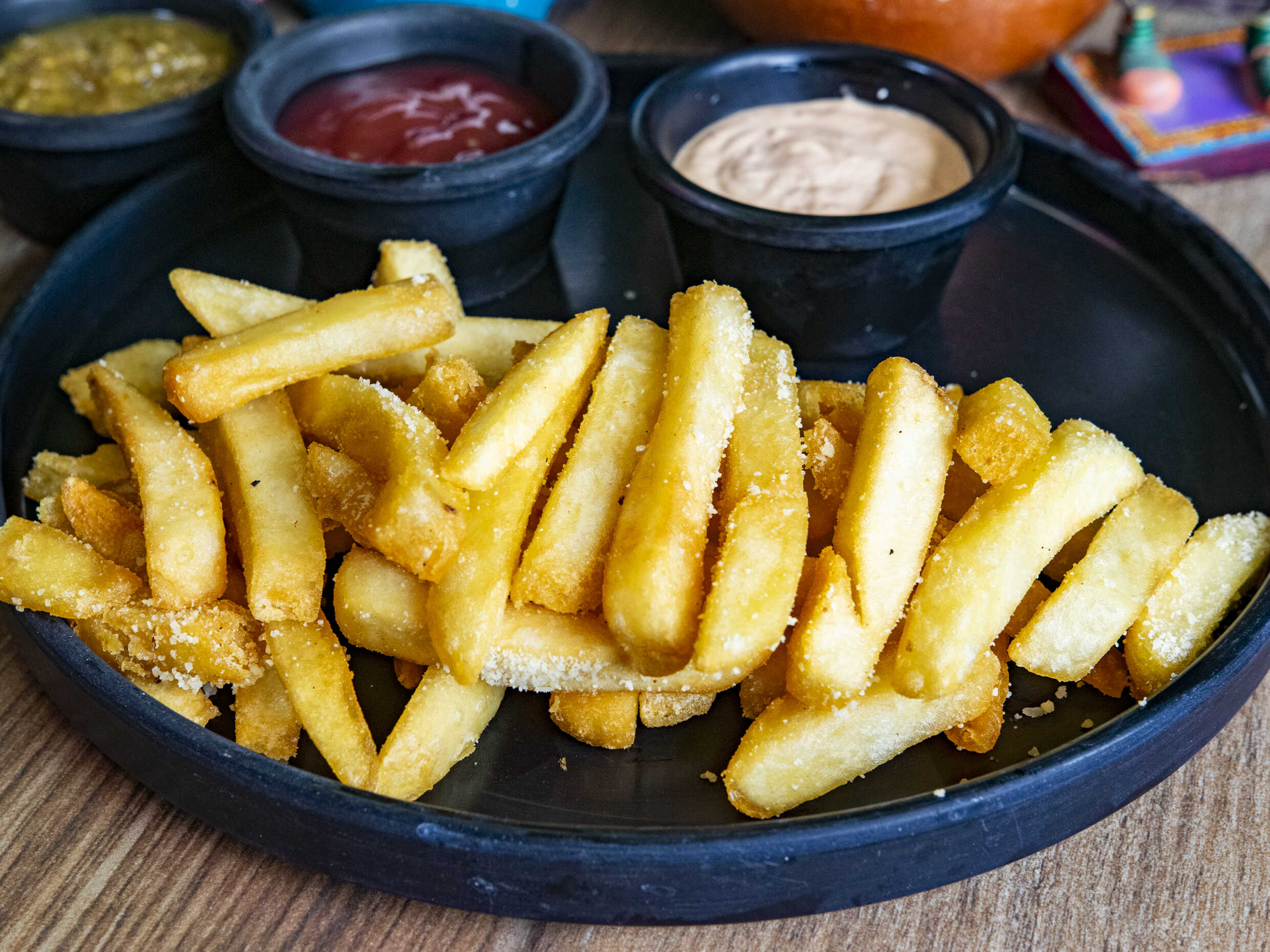 Papas francesas espolvoreadas con queso parmesan, acompañado de catsup y aderezo