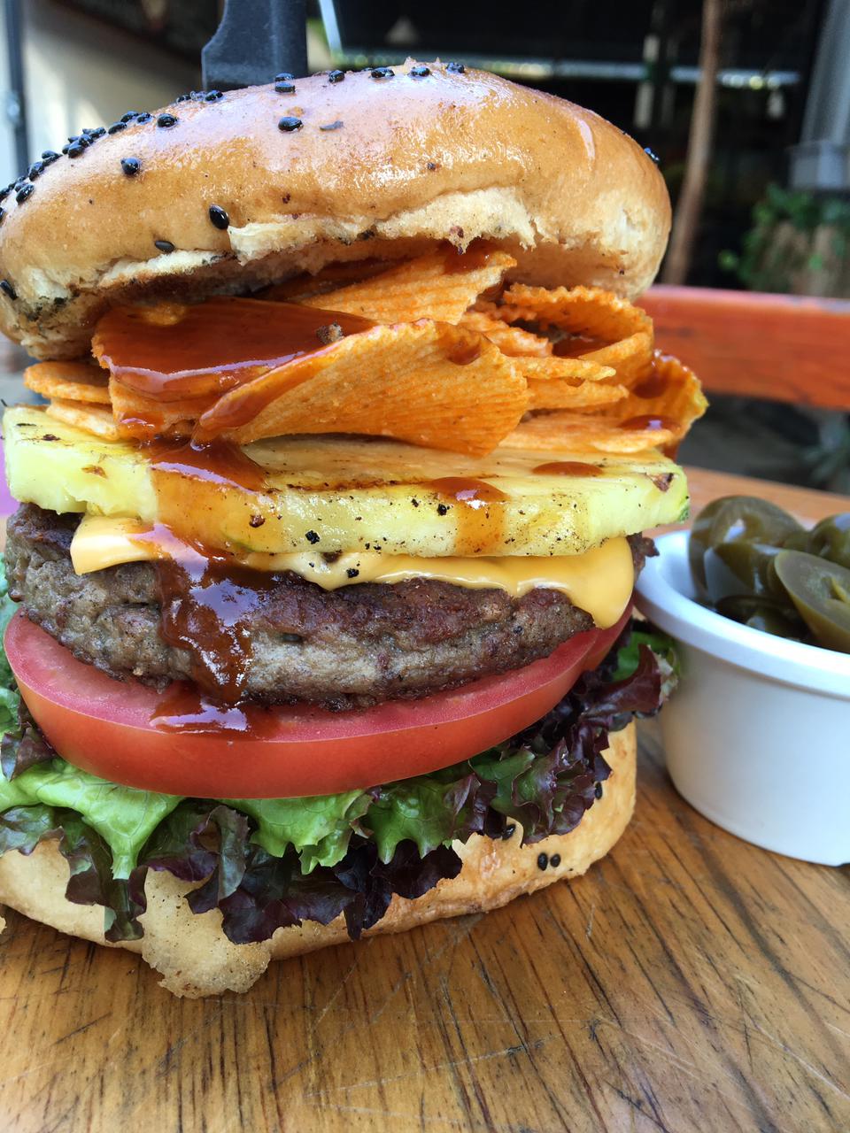 Carne de res, piña asada, Ruffles, salsa BBQ, lechugas, tomates, mayonesa, miel, queso manchego y mostaza.