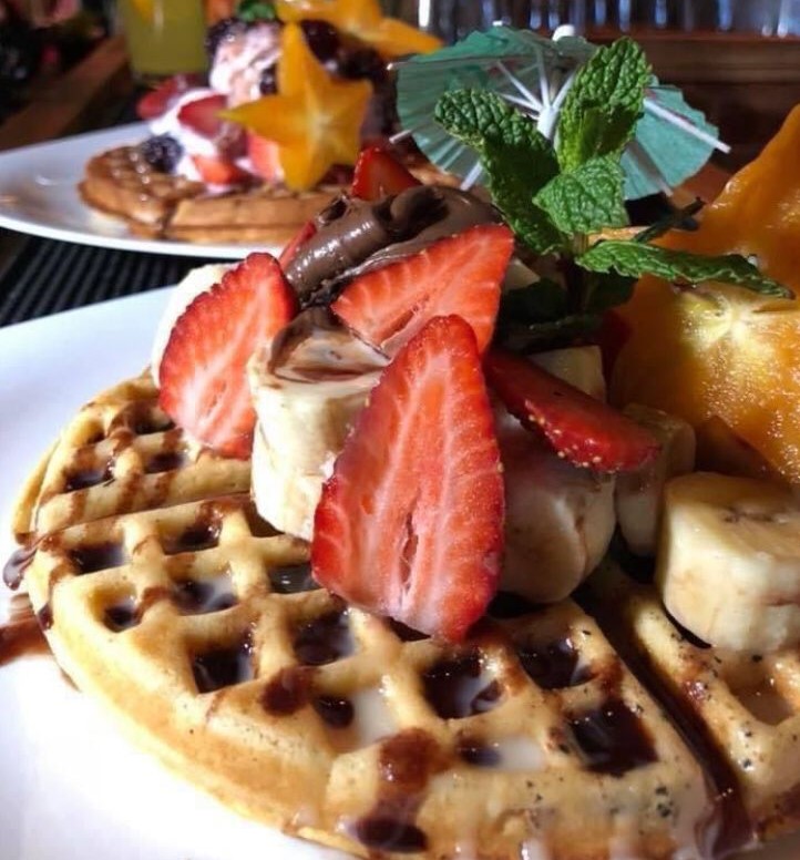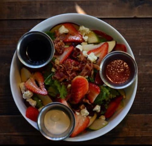 Mix de lechugas, selección de frutas; manzana, pera y fresas; acompañado de tiras de tocino, queso de cabra, arándanos deshidratados y aderezo dulce de miel maple.