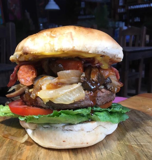 Carne de res, chistorra, queso manchego, champiñones salteados con cebolla, tomate, lechuga, miel mostaza mayonesa y salsa BBQ.