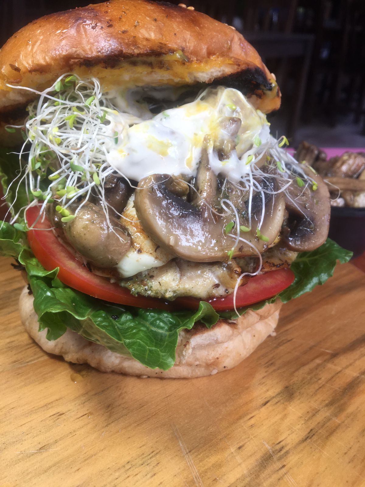 Pechuga de pollo al carbón, germen de alfalfa, champiñones, queso manchego, tomate, lechuga, mayonesa de jengibre, miel mostaza y aderezo de la casa.