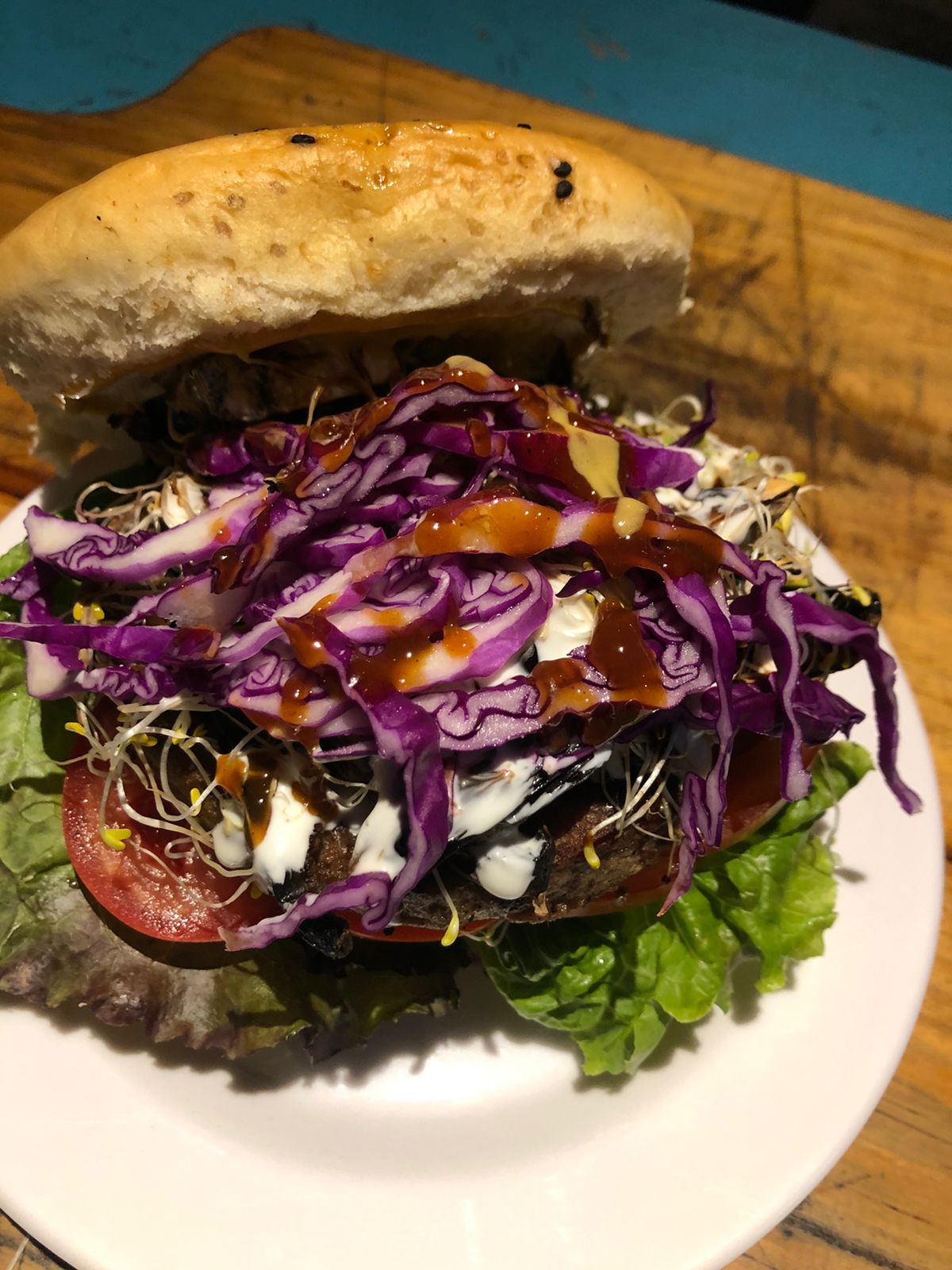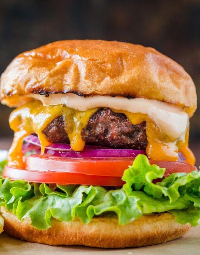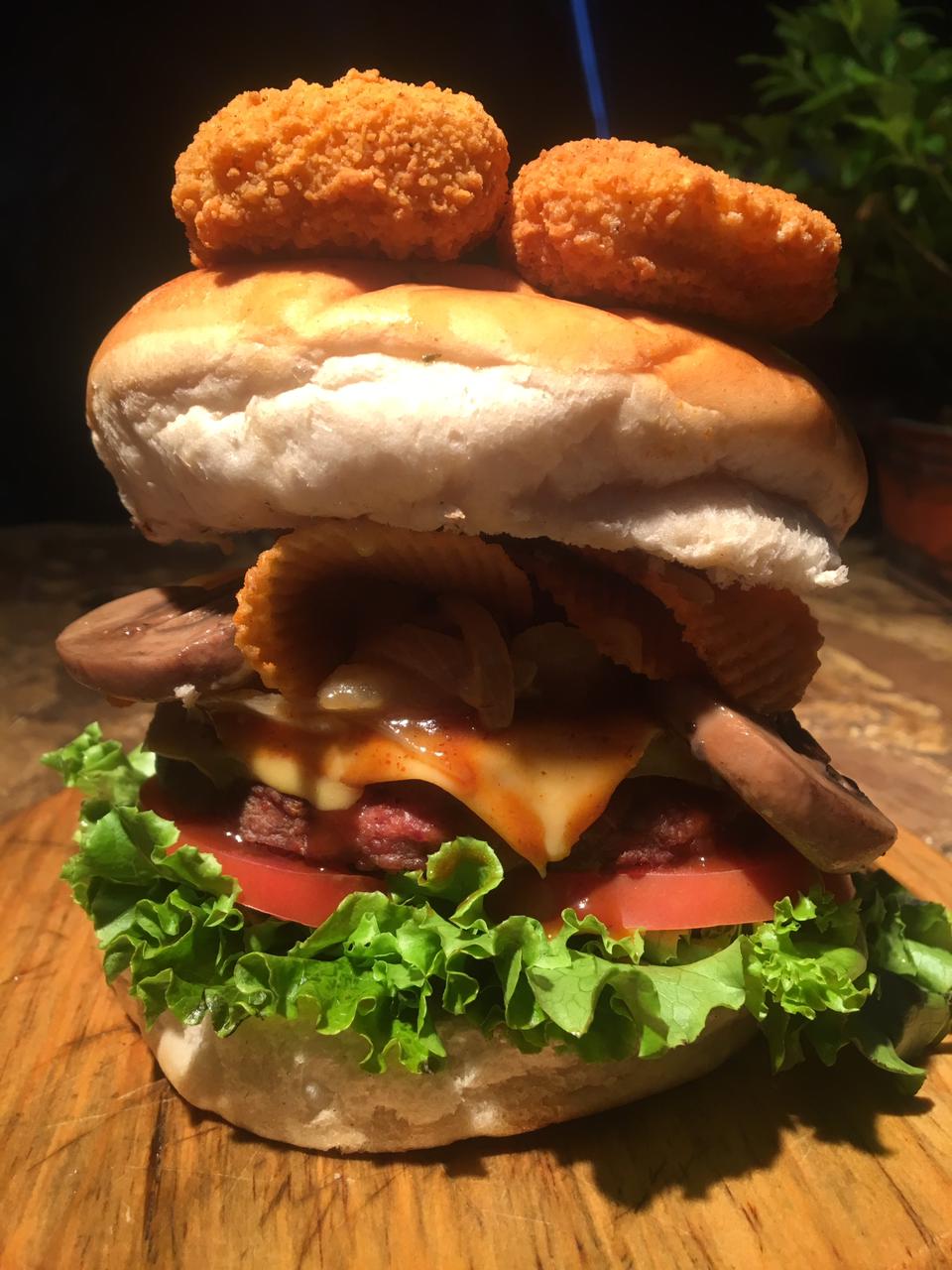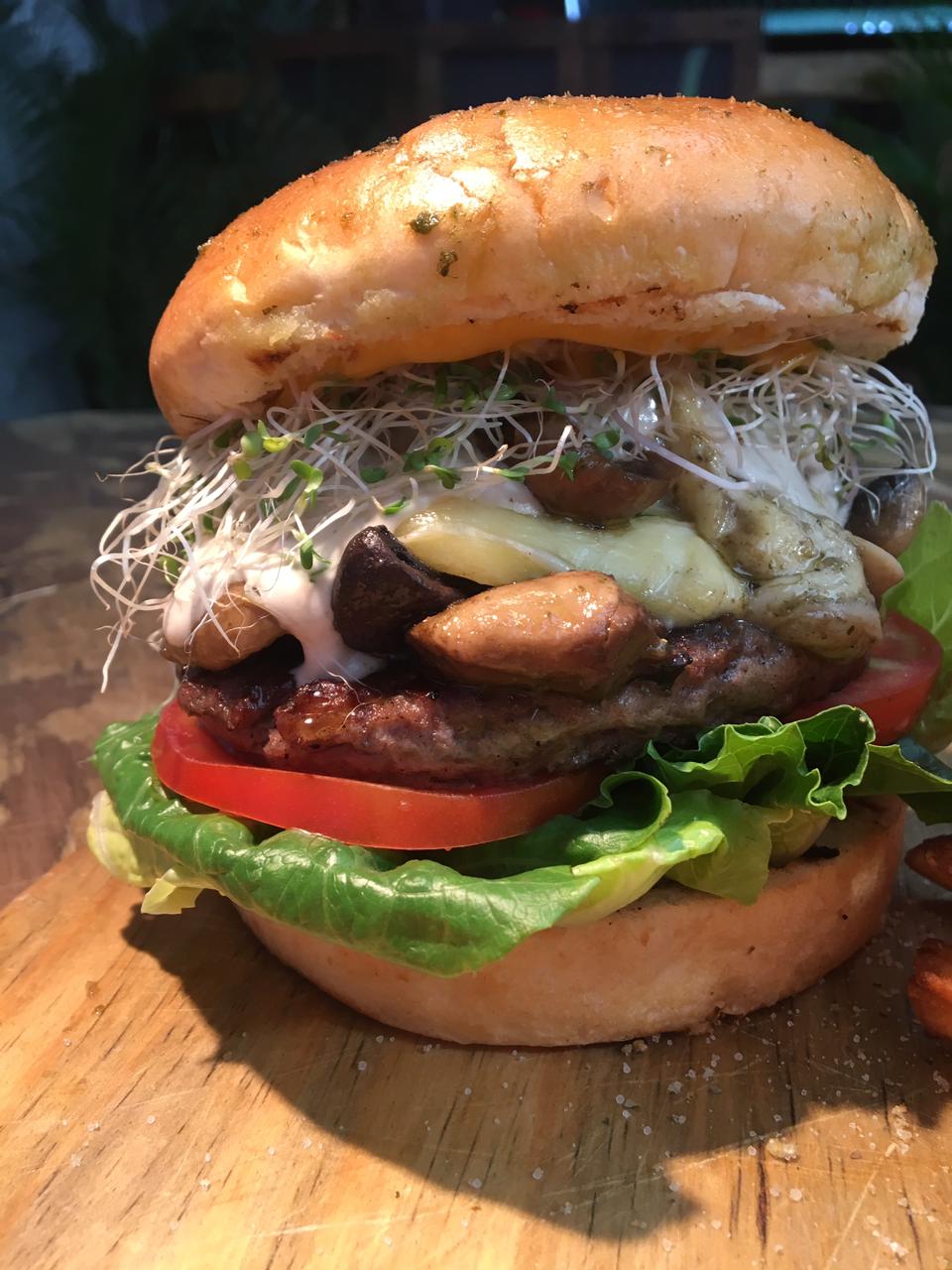 Carne de res, aderezo de la casa, queso de cabra, champiñones, tocino, queso cheddar lechuga, tomate, mayonesa y miel mostaza.
