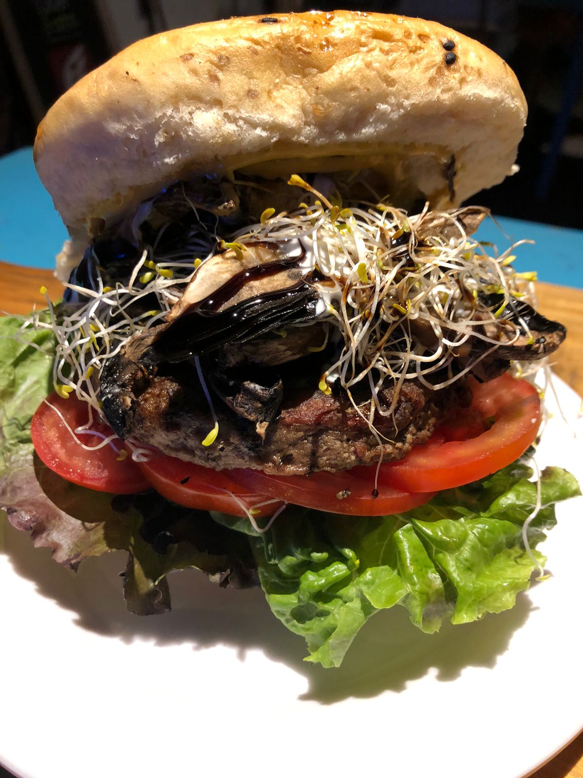 Carne de res, hongos portobello, germen, queso azul, provolone, glase de vinagre balsámico, lechuga, tomate, mayonesa y dip de mostaza.