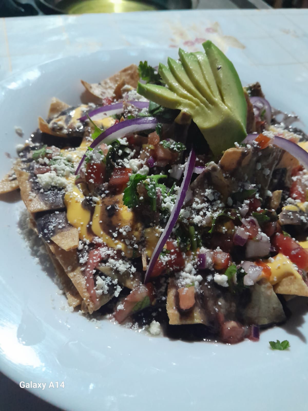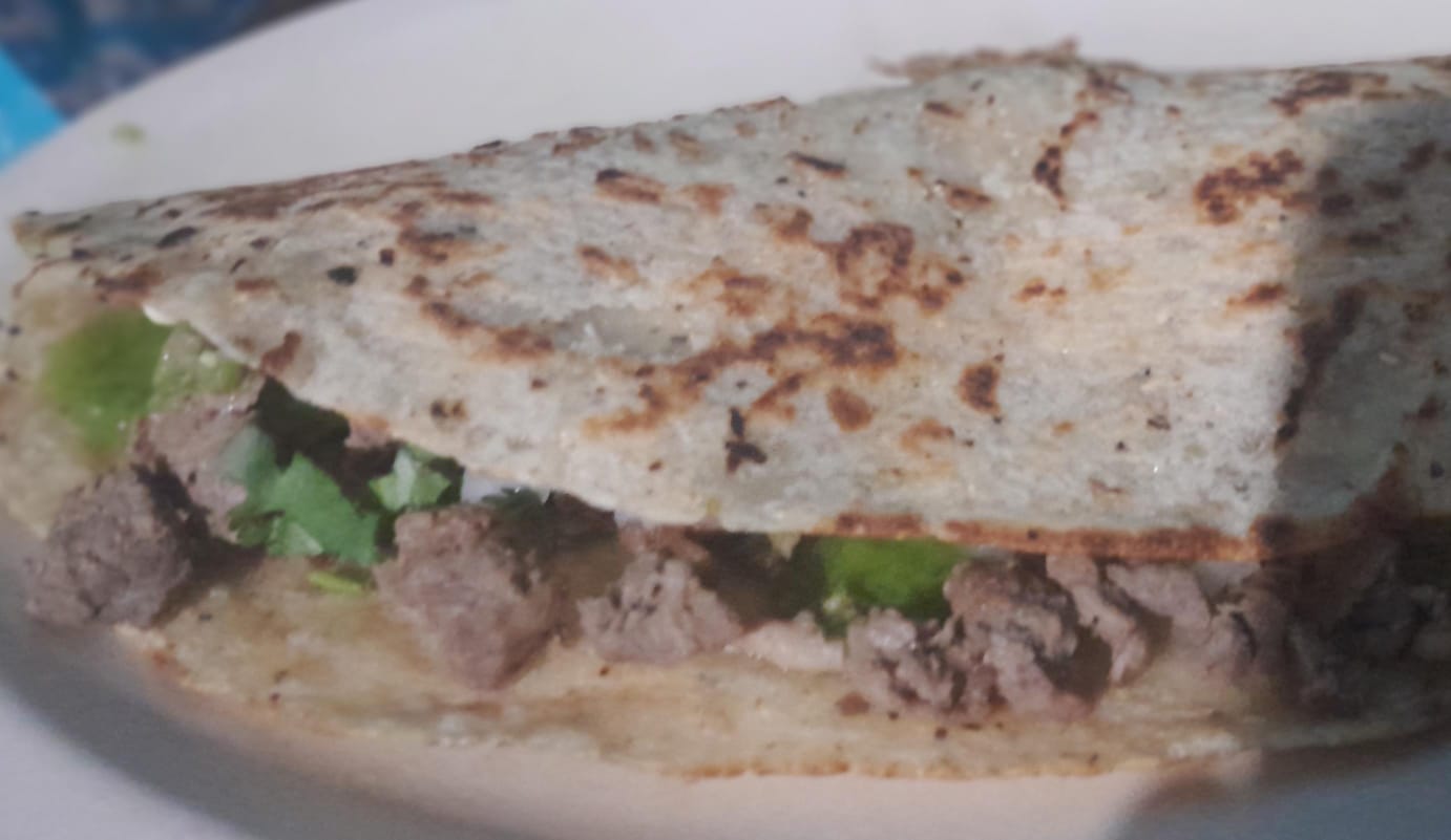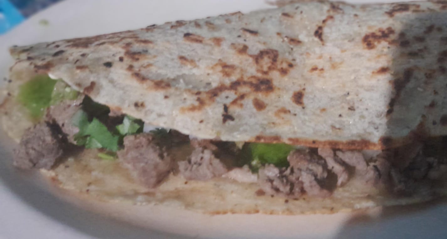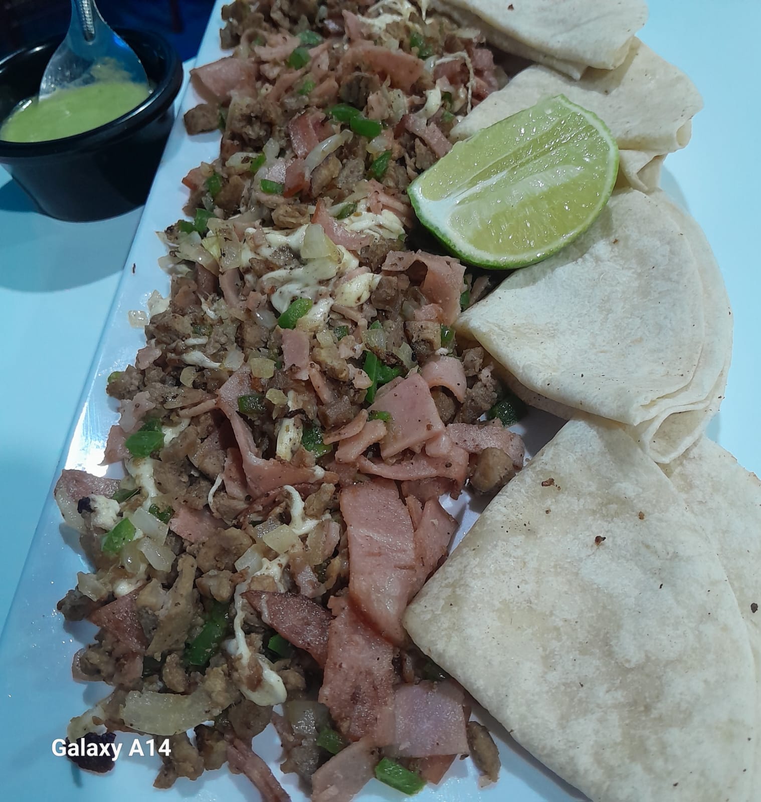 Bistec, jamón, tocino, pimiento verde y quesillo. Acompañado de tortillitas, limones y salsa verde.