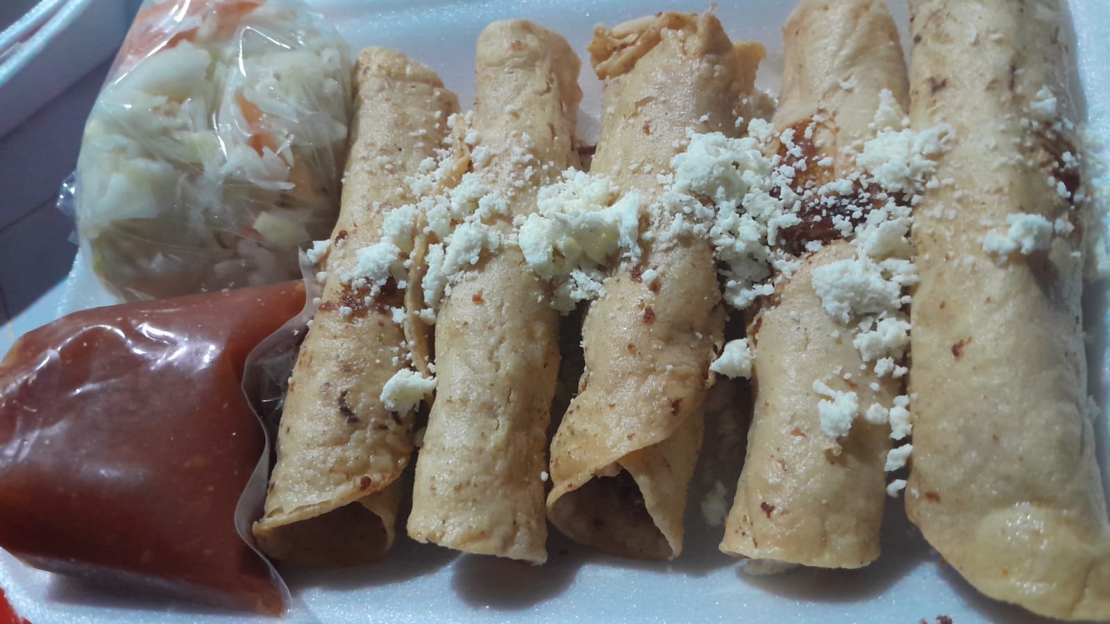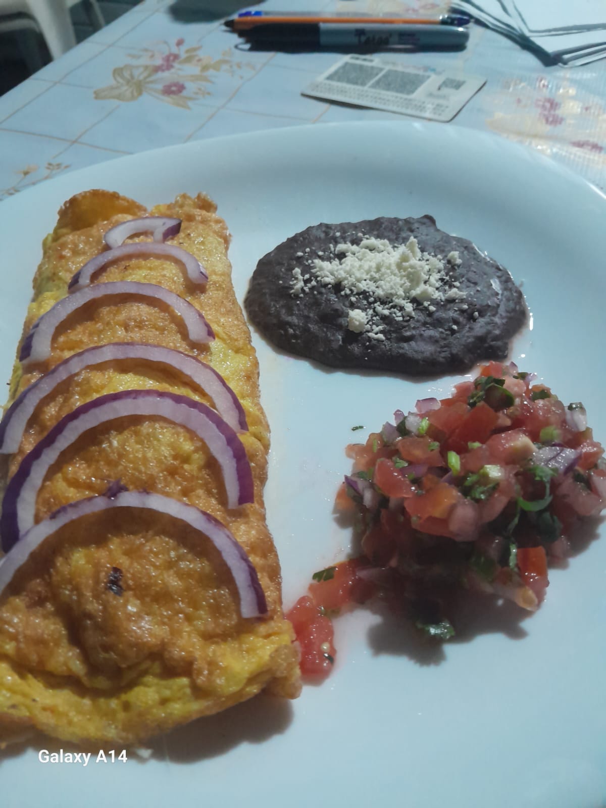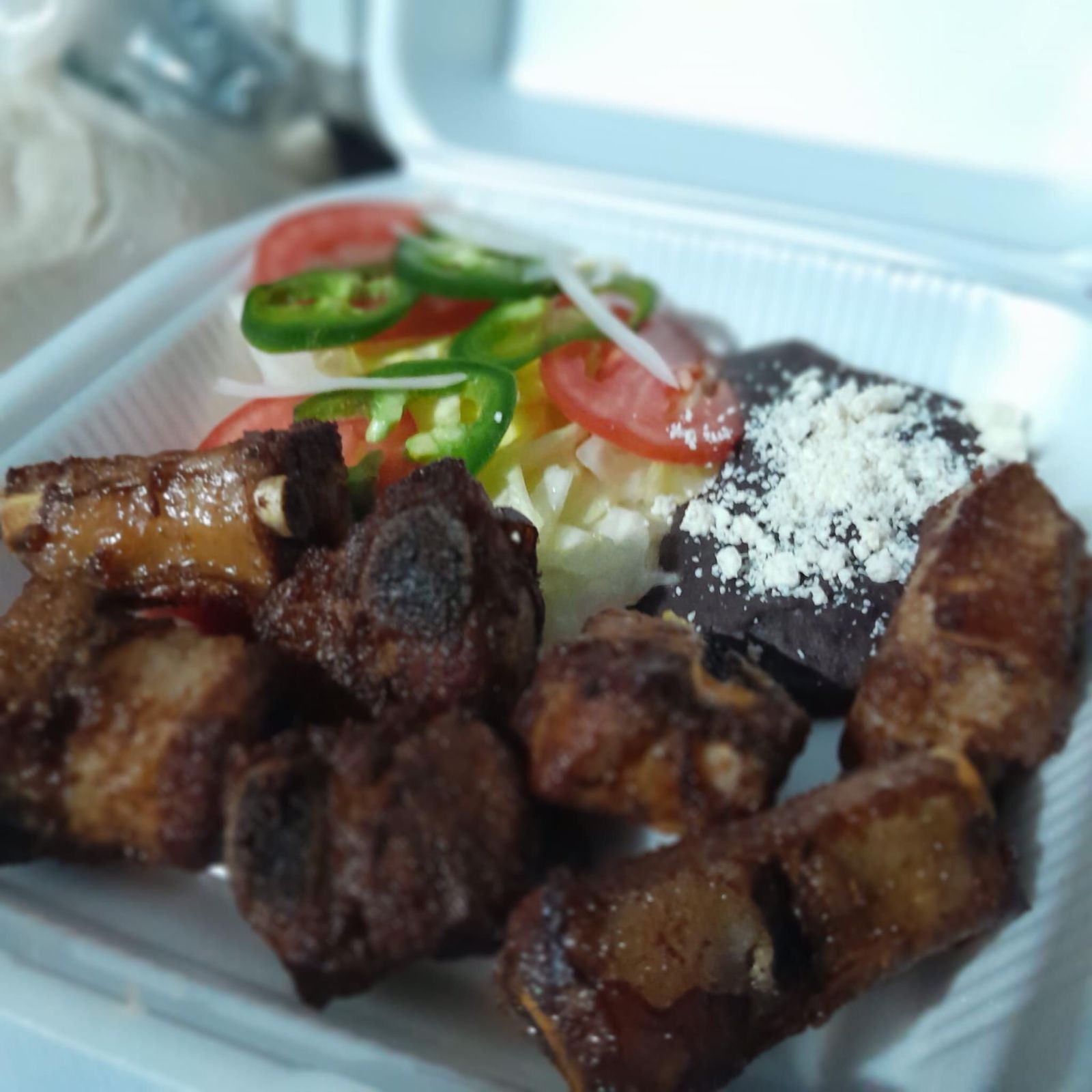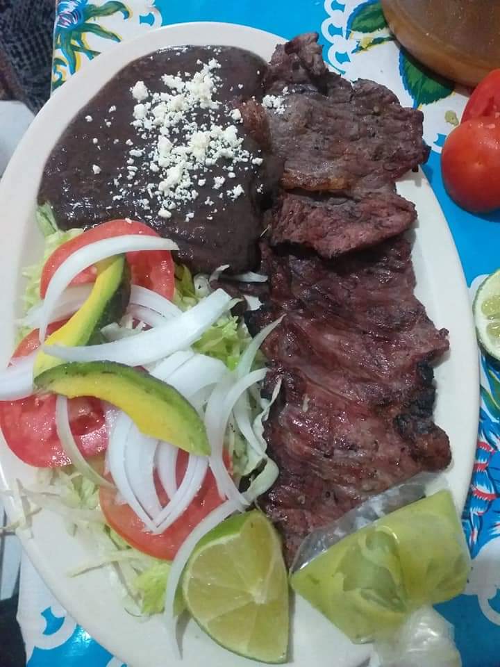 Acompañado de frijolitos fritos, ensalada y tortillas.