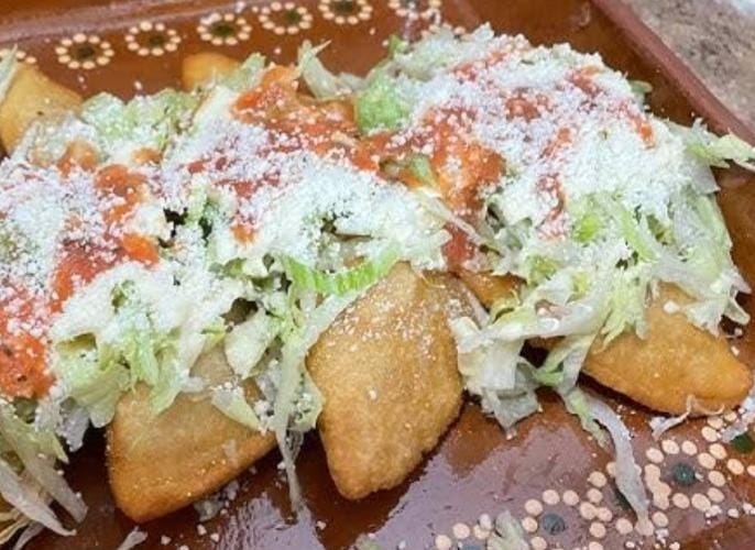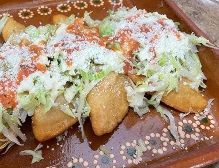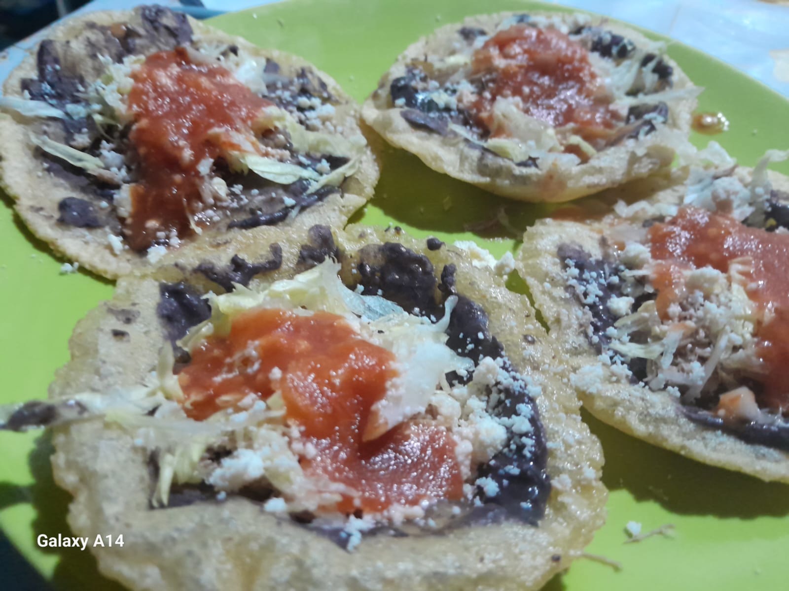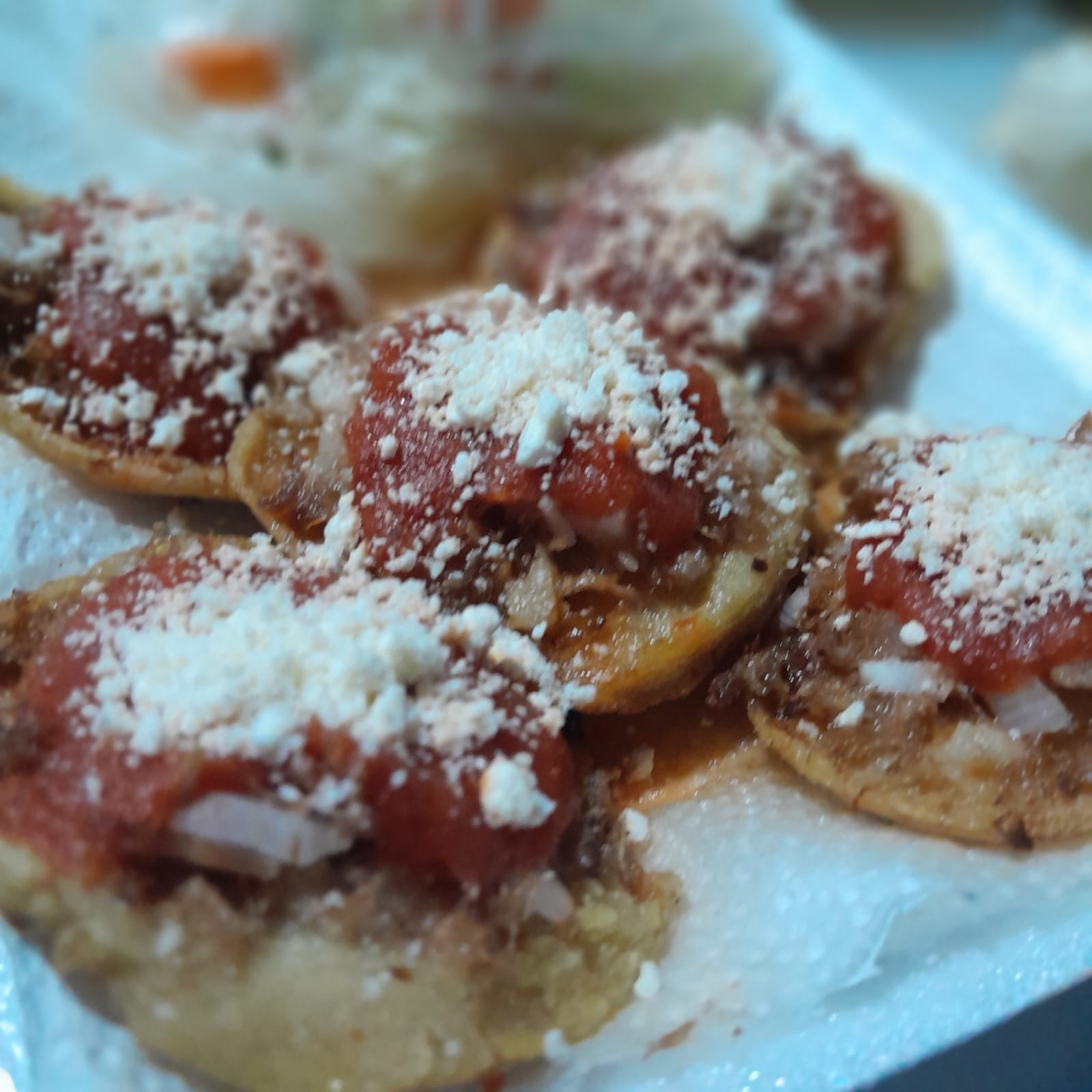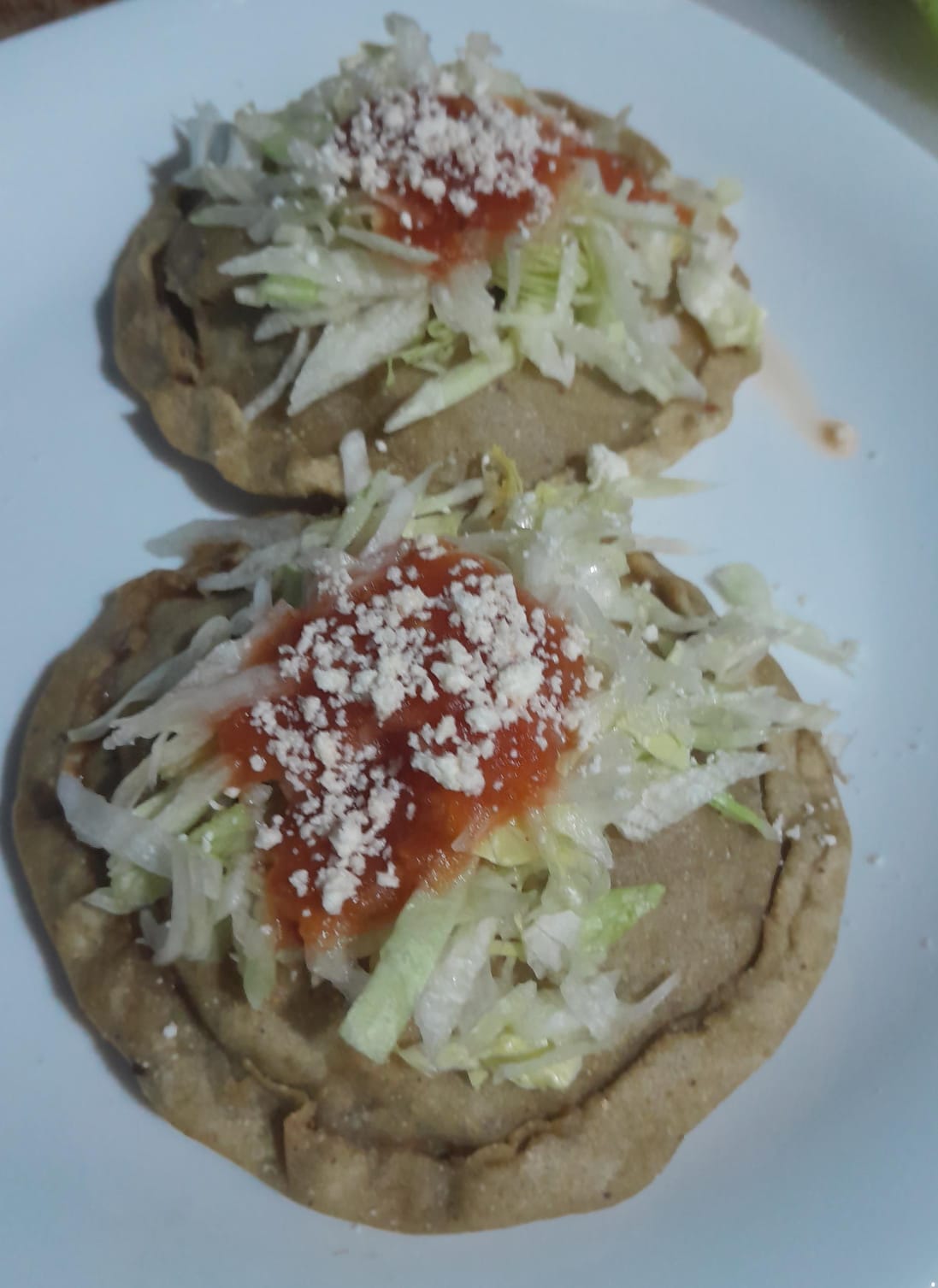Tortilla de maíz, sopes con salsa roja y repollo envinagrado. Porción personal.