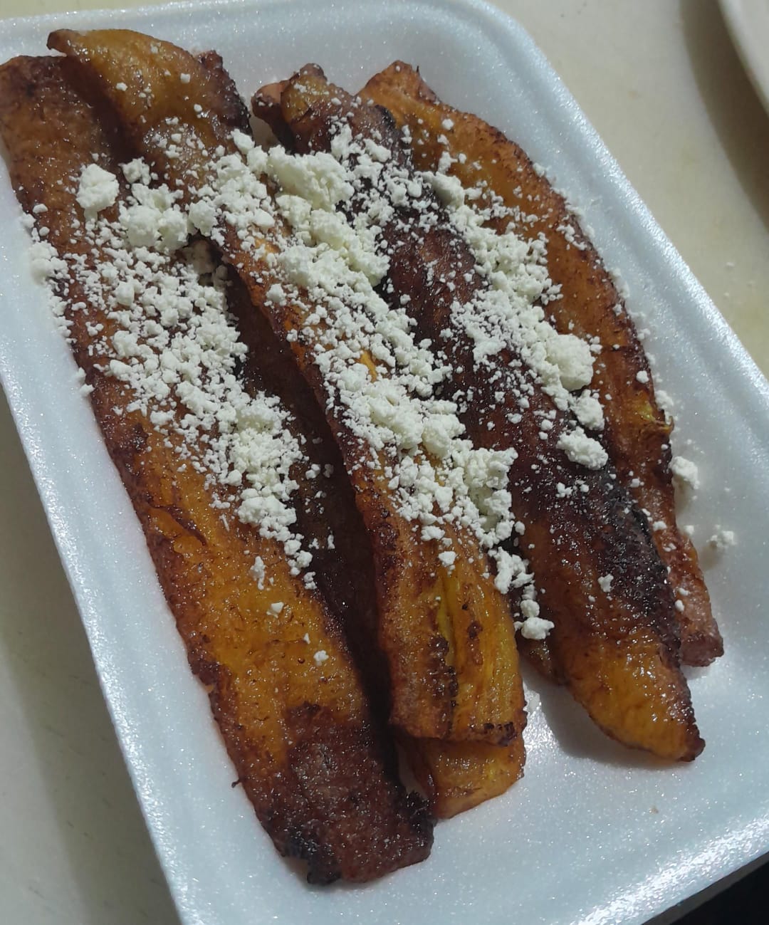 Dos platanitos, 5 a 6 rodajas, queso fresco y crema.