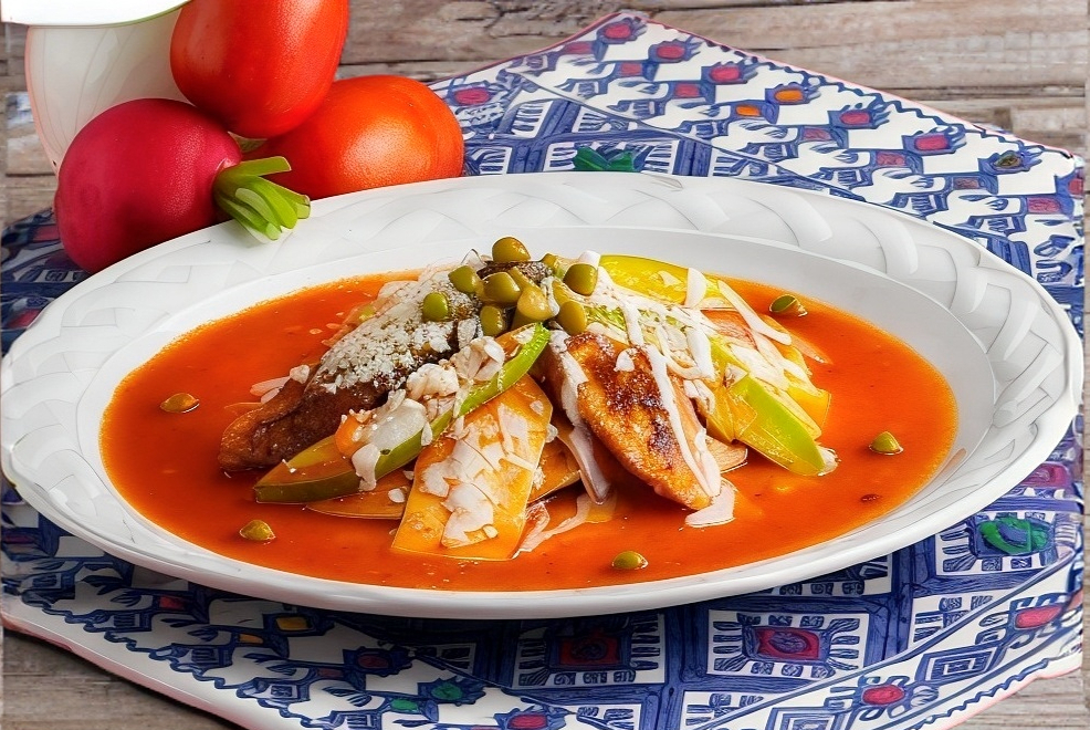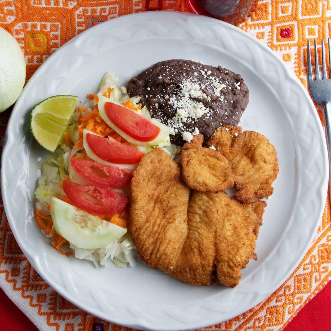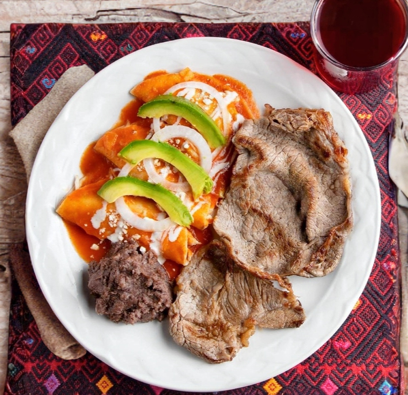 Frituras de maíz bañados en salsa roja, con fajitas de res, coronados con crema y queso chiapaneco y son acompañados con frijol y plátanos fritos.