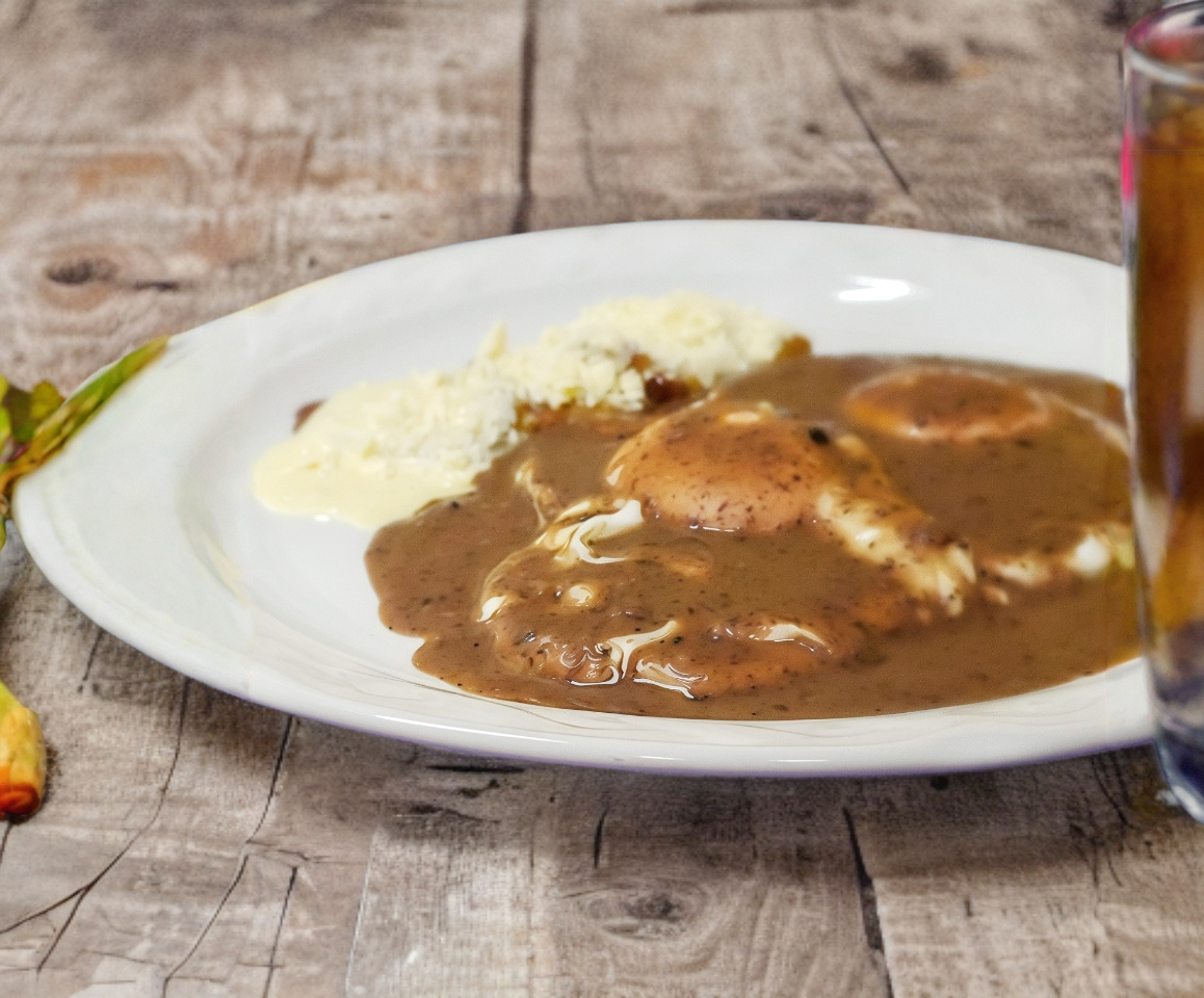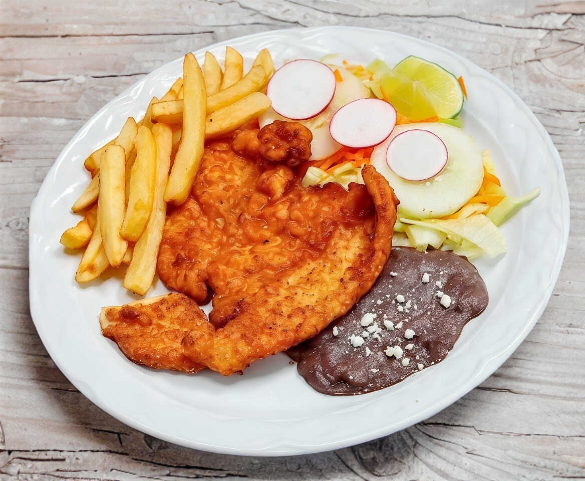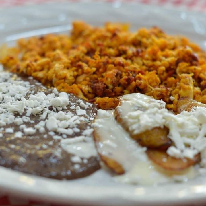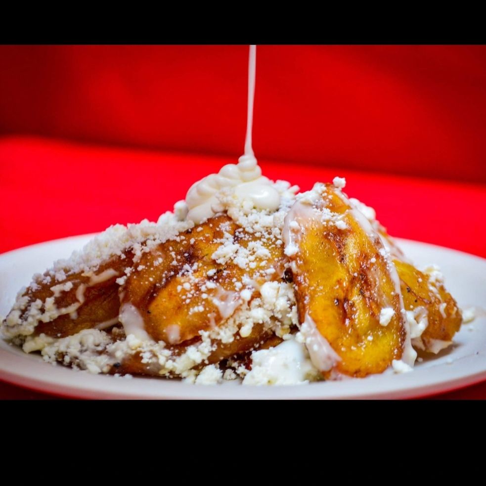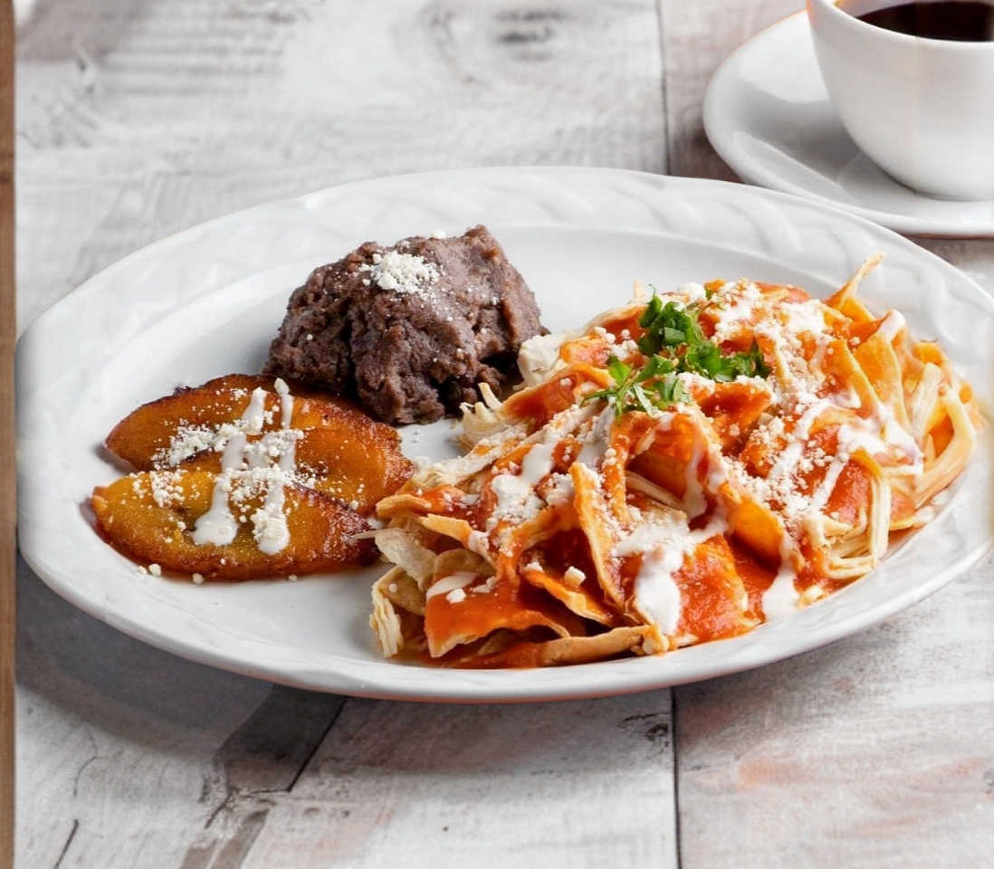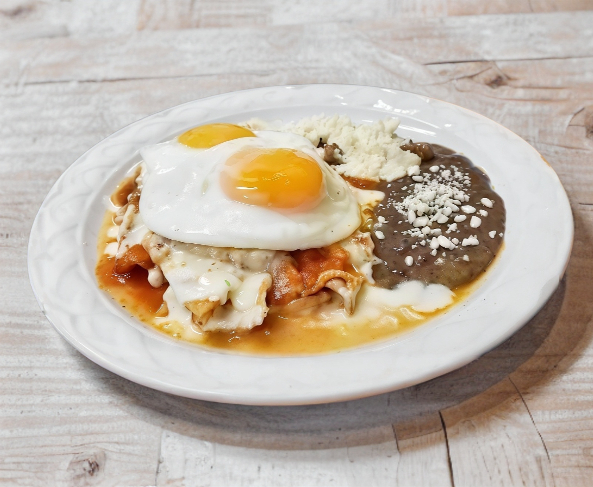Fritura de maíz con una deliciosa combinación de sabores pollo, huevos estrellados, bañados en salsa roja, coronados en crema, queso y acompañados de plátanos fritos y frijoles.
