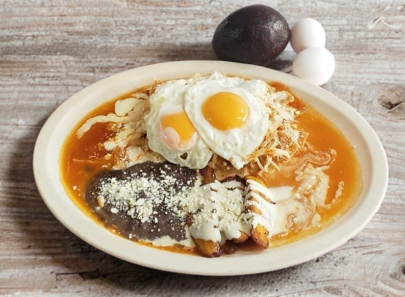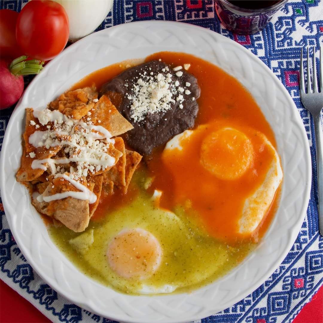 Frituras de maíz bañados en salsa roja con dos piezas de huevos estrellados, coronados con crema y queso chiapaneco y son acompañados con frijol y plátanos fritos.