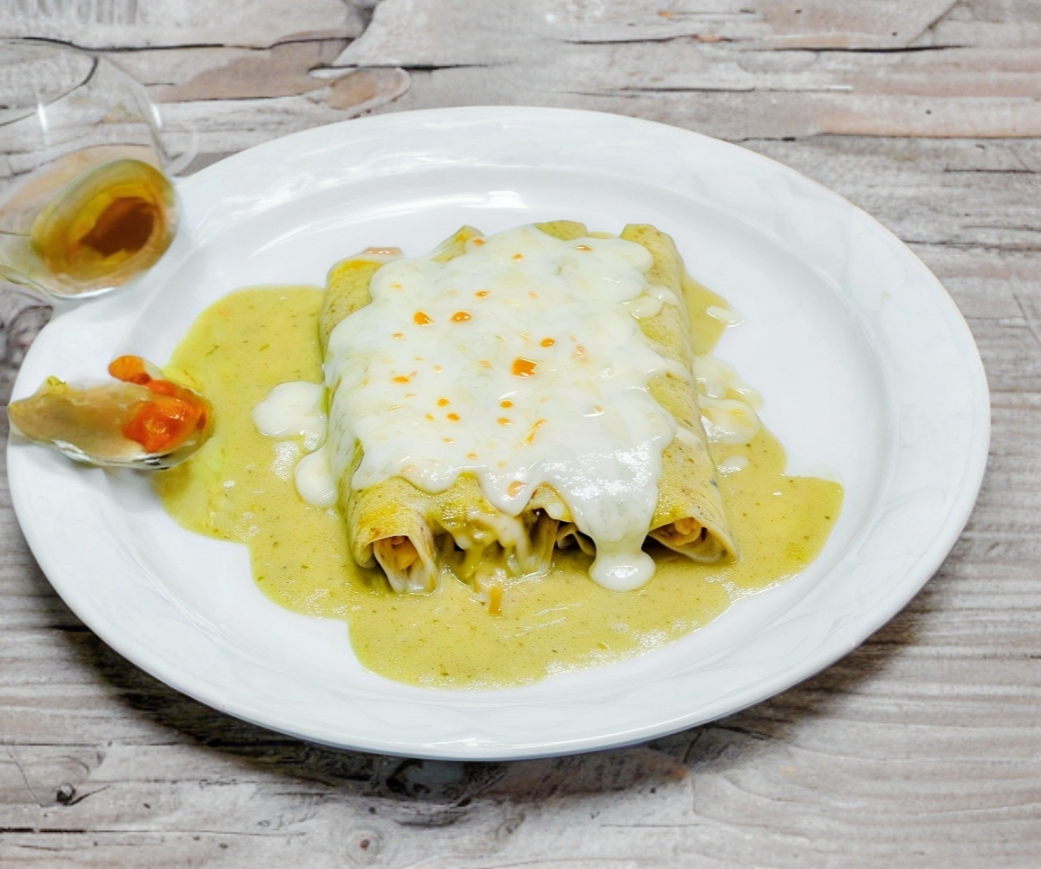 4 piezas. Deliciosas enchiladas rellenas de pollo o queso panela bañadas con una rica salsa verde picosita.