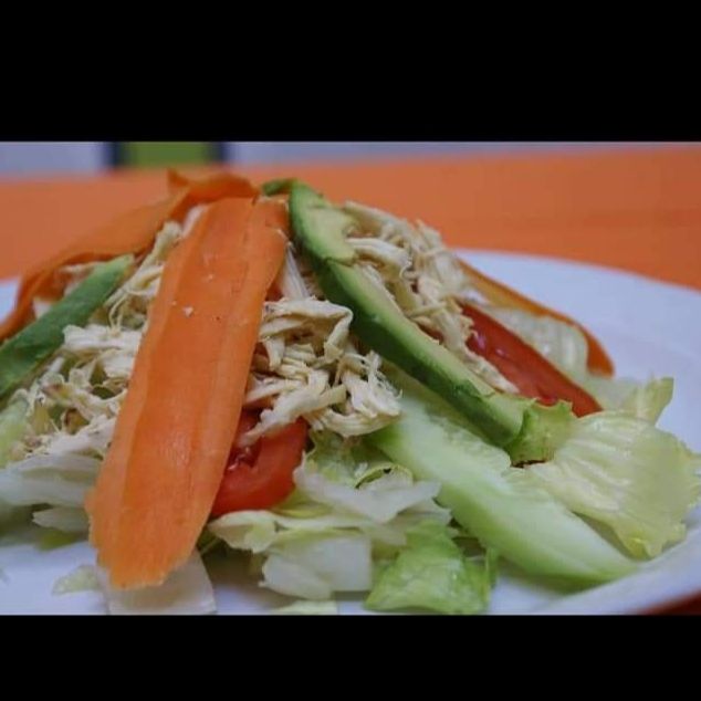 Pechuga de pollo deshebrada, gajos de tomate, pepino, zanahoria y aguacate. Incluye crotones y aderezo.