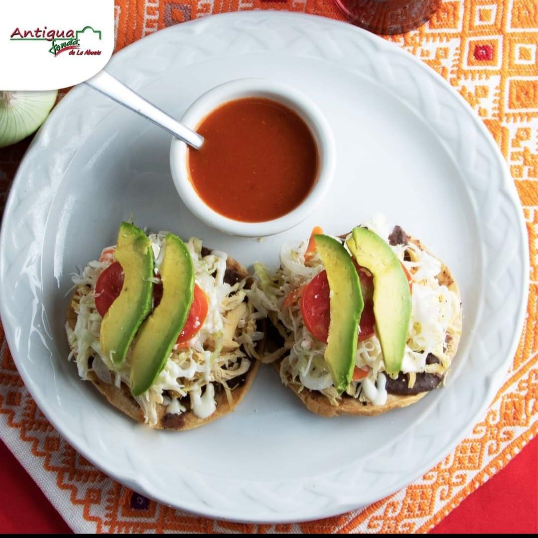 Fritura de maíz untada con frijol, con una cama de pechuga de pollo deshebrado acompañada de aguacate, tomate, repollo curtido, crema y queso.