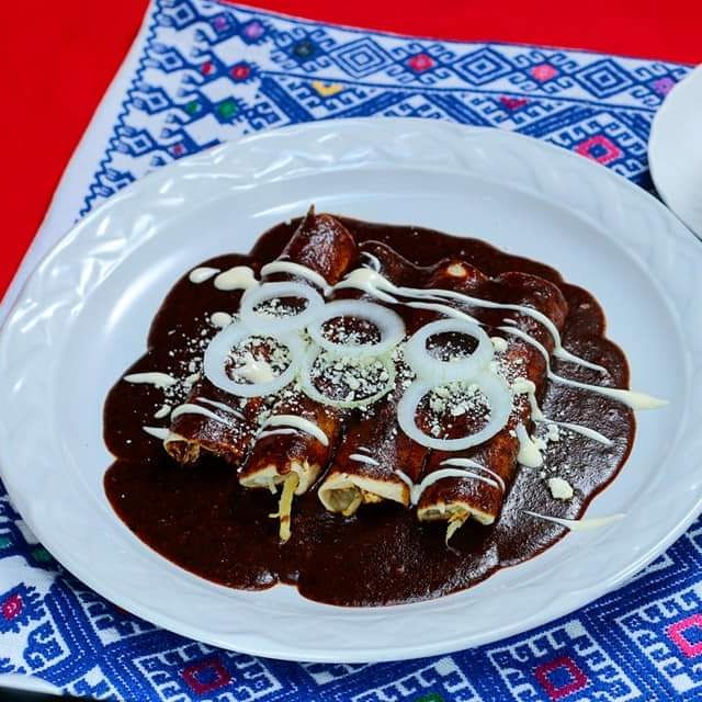2 piezas. Rollos de tortilla relleno de queso panela o pollo. Bañados de mole hecho en casa.