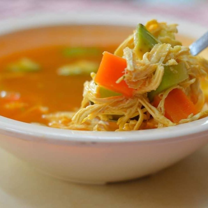 Delicioso caldo de pollo, con pechuga deshebrada, verdura y chile chipotle.