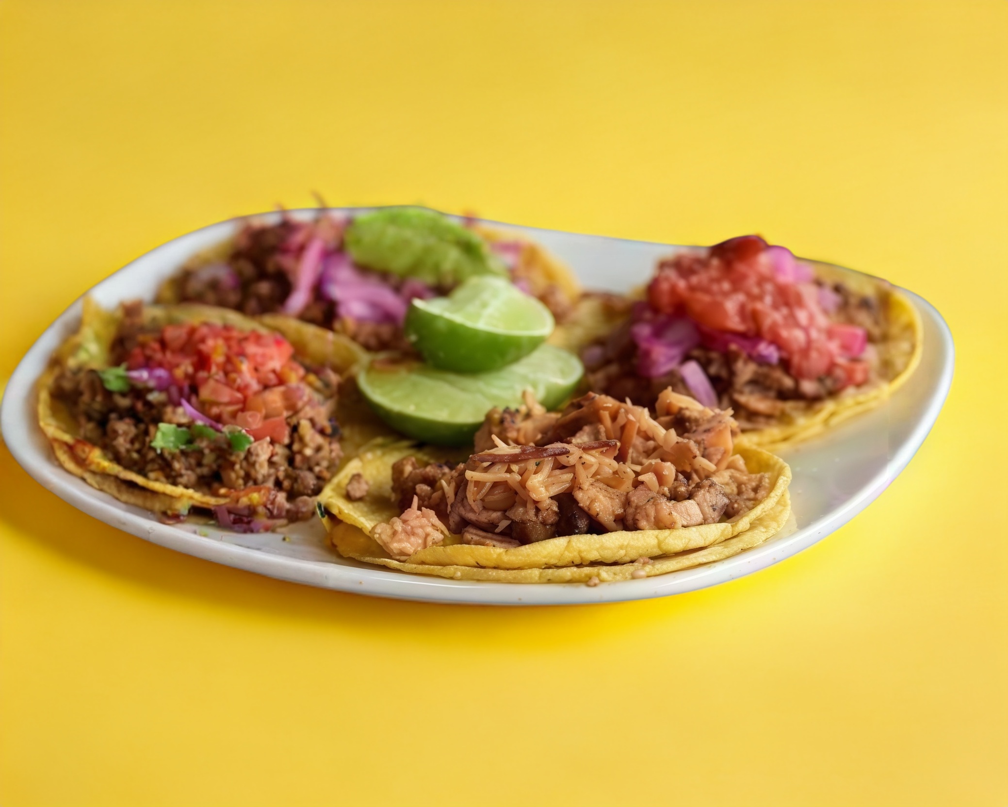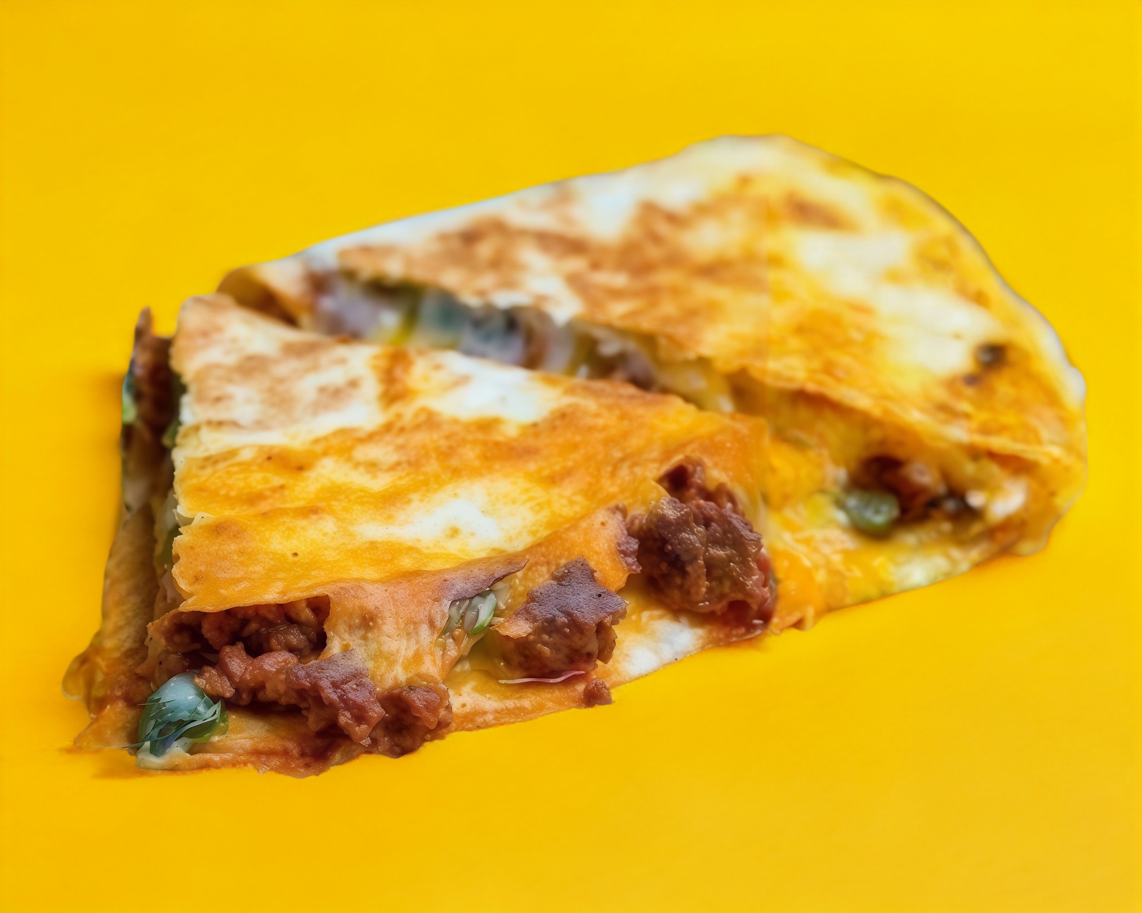 Tortilla de harina 20 cm, incluye : guiso a elegir, lechuga, chile de rajas, frijol refrito y queso manchego. Adicional salsa verde y cebolla curtida morada.