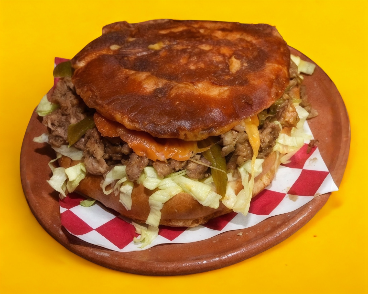 Pan de hamburguesa, guiso a elegir, lechuga, jamon, queso amarillo, chile de rajas, frijol refrito,queso manchego. Adicional salsa verde y cebolla morada.