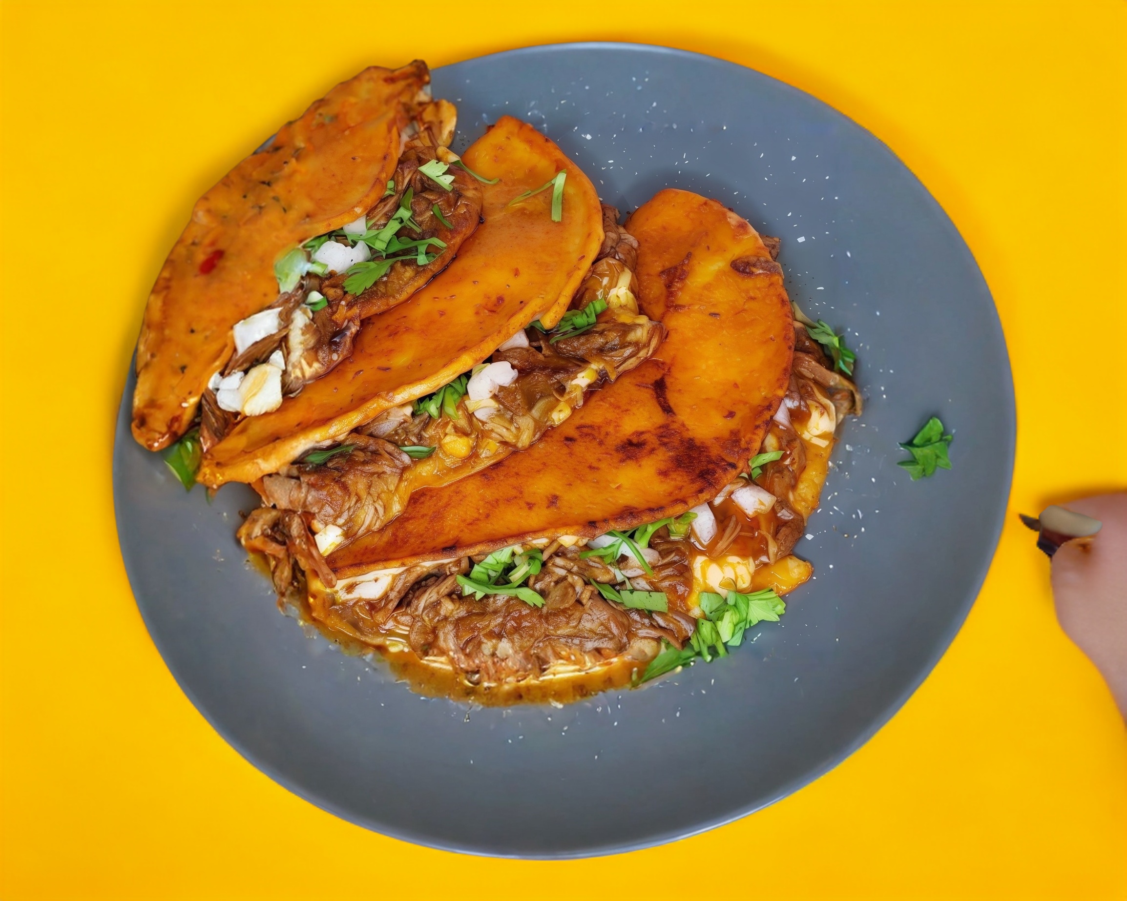 Tortilla normal , guiso a tu elección, queso manchego gratinado bañado en consome. Adicional salsa verde , cebolla con cilantro y limon
