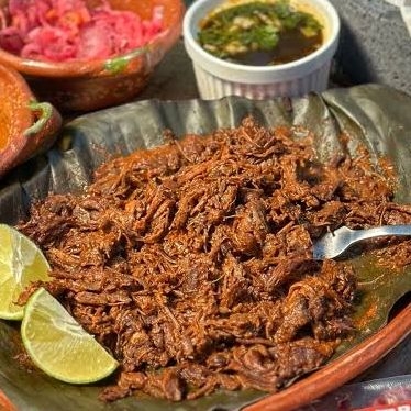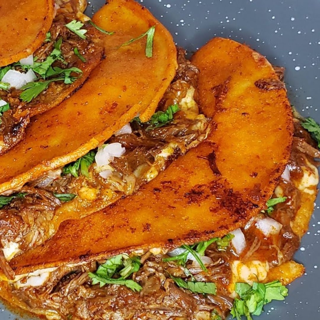 Tortilla crujiente, barbacoa y queso manchego. Complementos cebolla cilantro, limones y salsa. Total y tacos