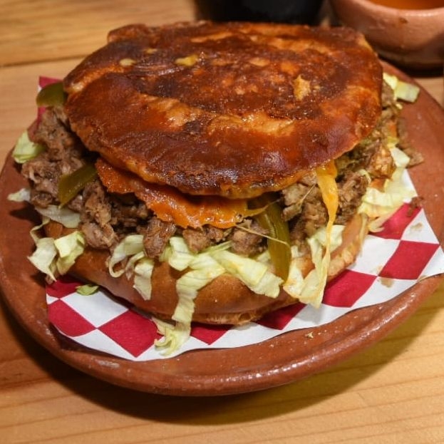 Pan de telera incluye guiso a elegir, chile de rajas, tomate, lechuga, frijol refrito. Adicional salsa verde y cebolla morada.