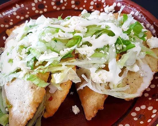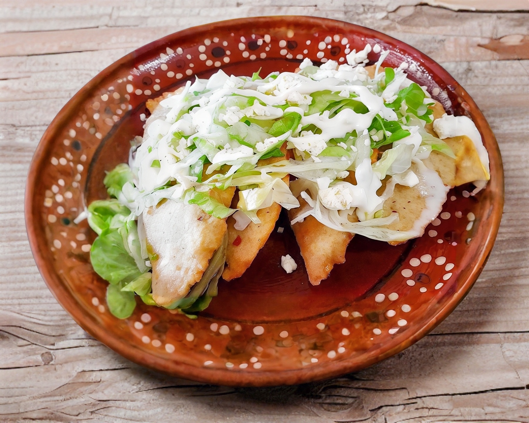Tortilla frita con frijol, pollo, repollo, salsa roja picante, queso, crema y aguacate.