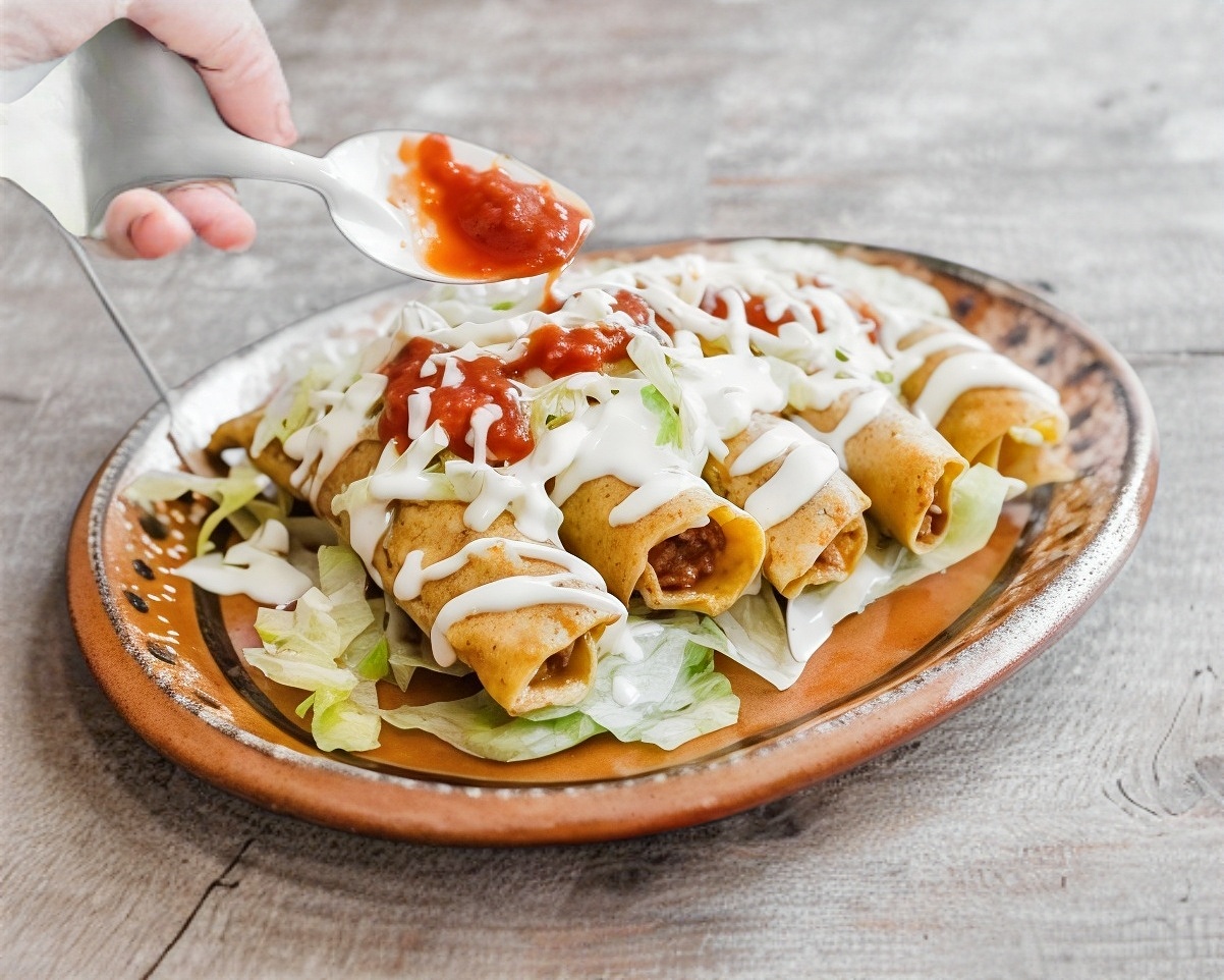 5 Piezas de tacos rellenos de pollo, acompañados de repollo, salsa, queso y crema.