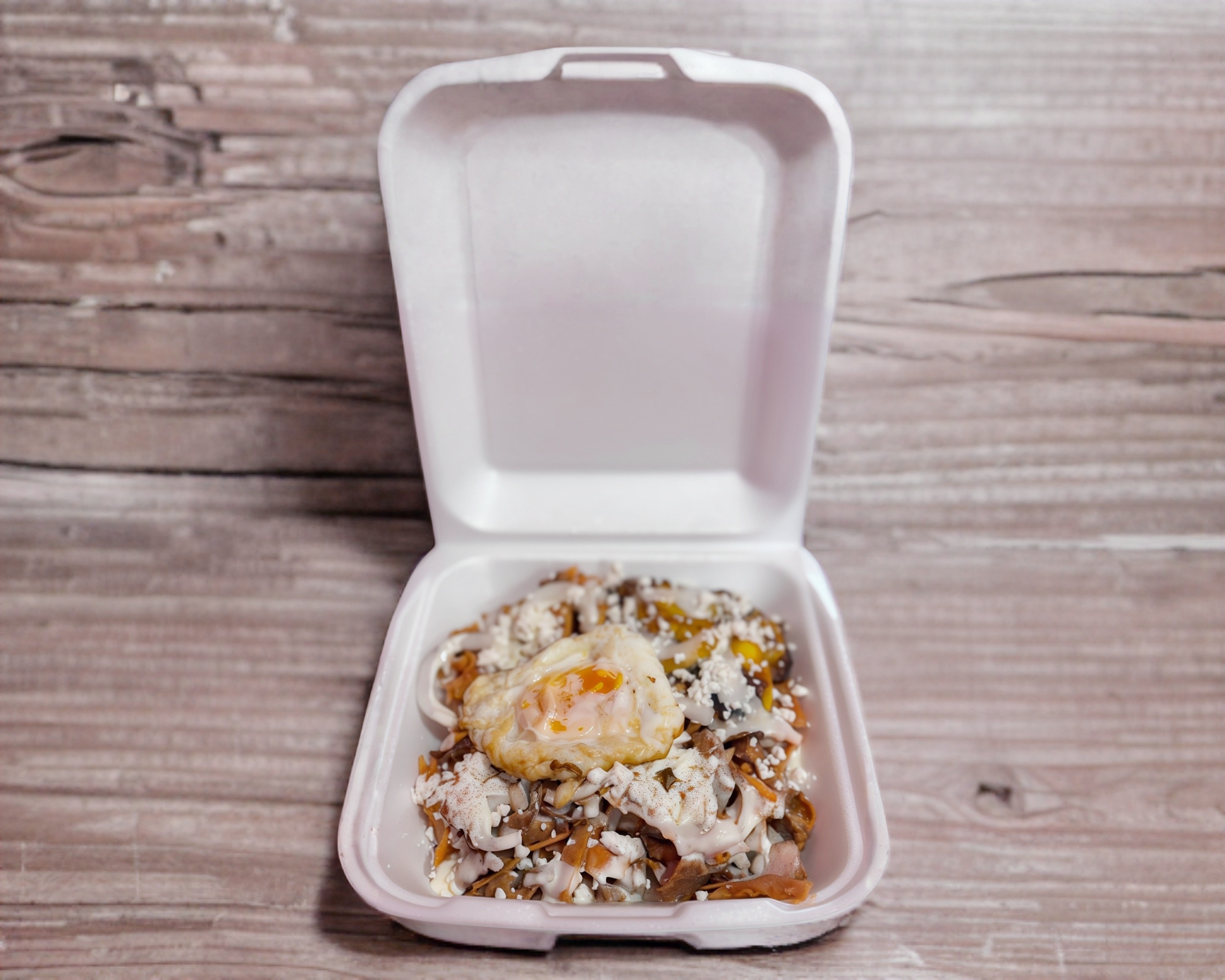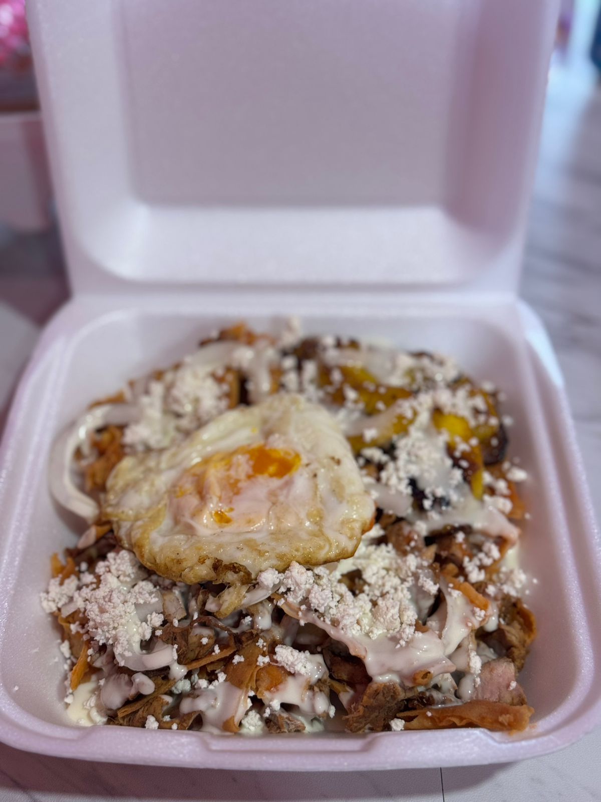 Ricos trocitos de tortillas fritas, de pollo acompañados 1 huevo estrellado, salsa roja picante, pollo, aguacate, queso y crema.