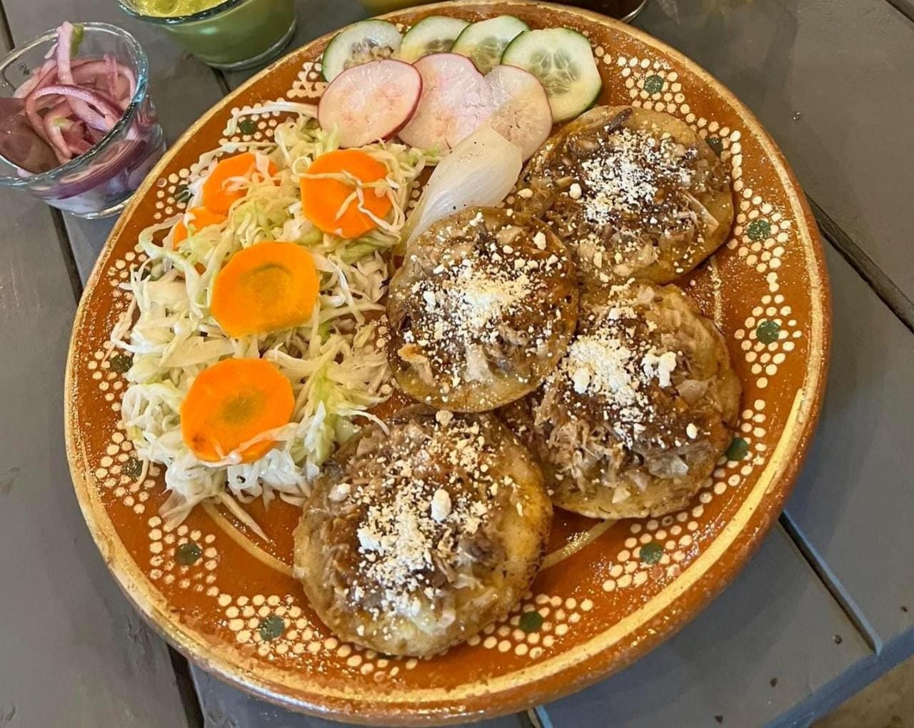 4 Piezas mini tortilla frita, servida con carne , repollo, queso y salsa de tomate.