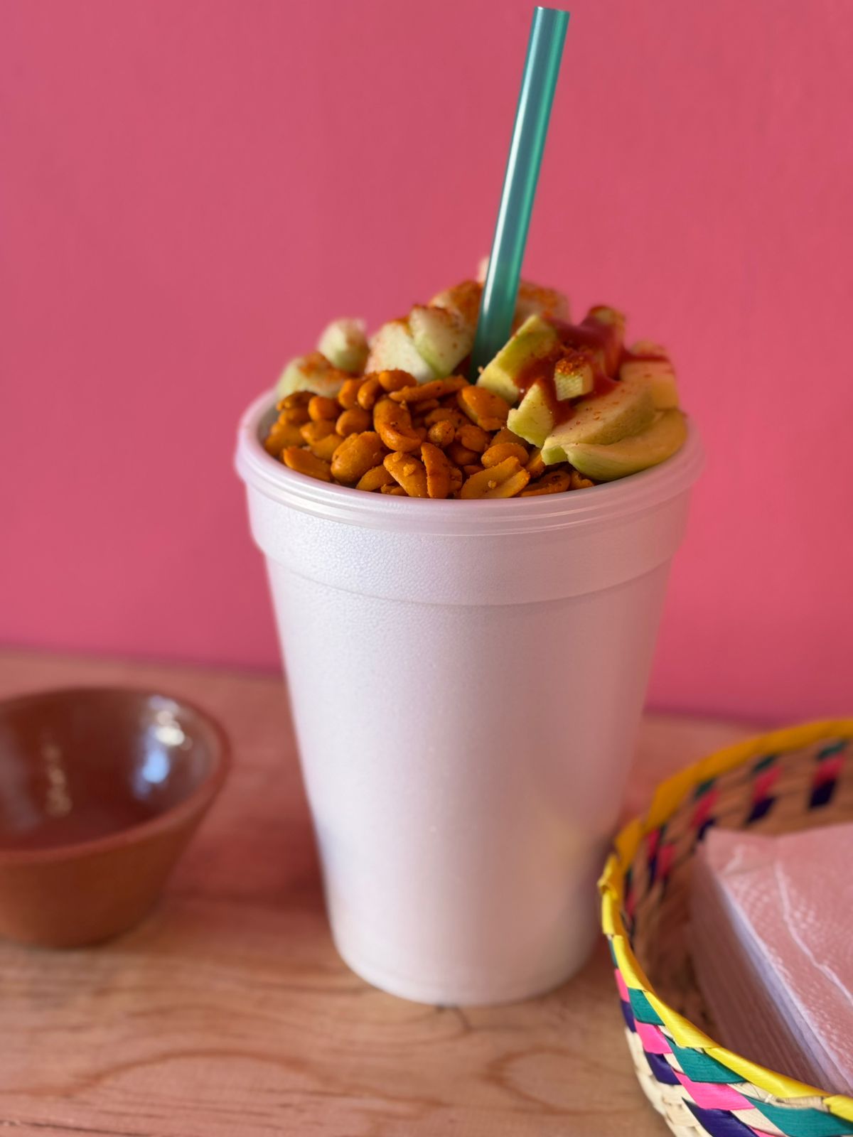Ricos trocitos de tortillas fritas, con carne asada, salsa roja picante, pollo, aguacate, queso y crema.