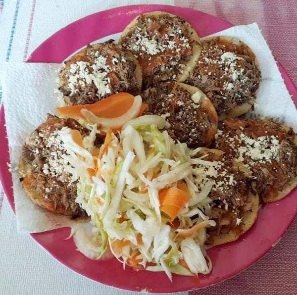Preparadas a base de maíz, con repollo envinagrado, salsa (con picante o sin picante a elegir) y queso. Guisos: pollo guisado con papas, queso y frijol, molida de res guisado con papas.