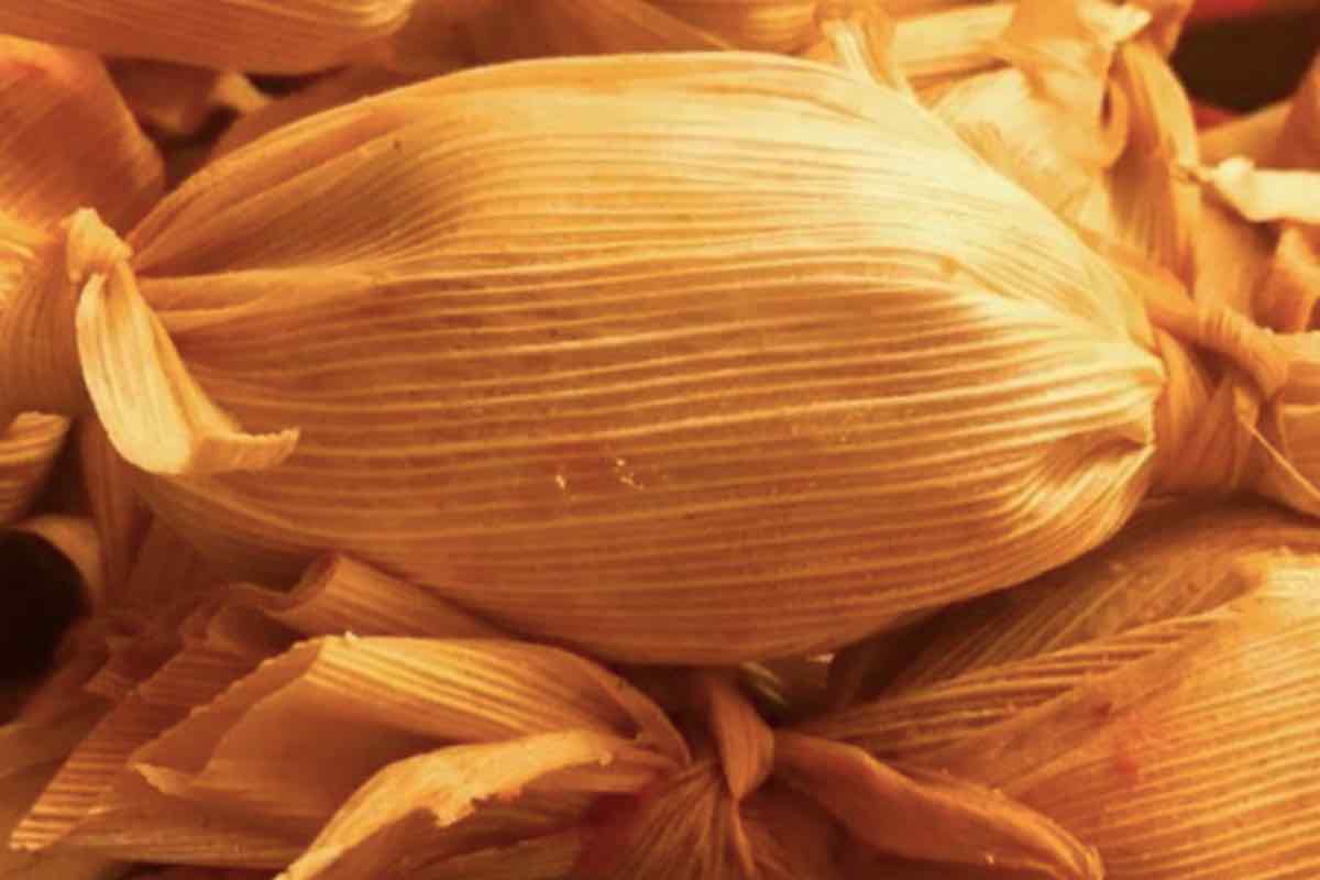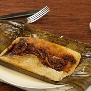 Preparado con masa de maíz, carne de puerco, salsa de tomate rojo con chile huajillo. Envuelto en hoja de totomoxtle.