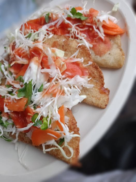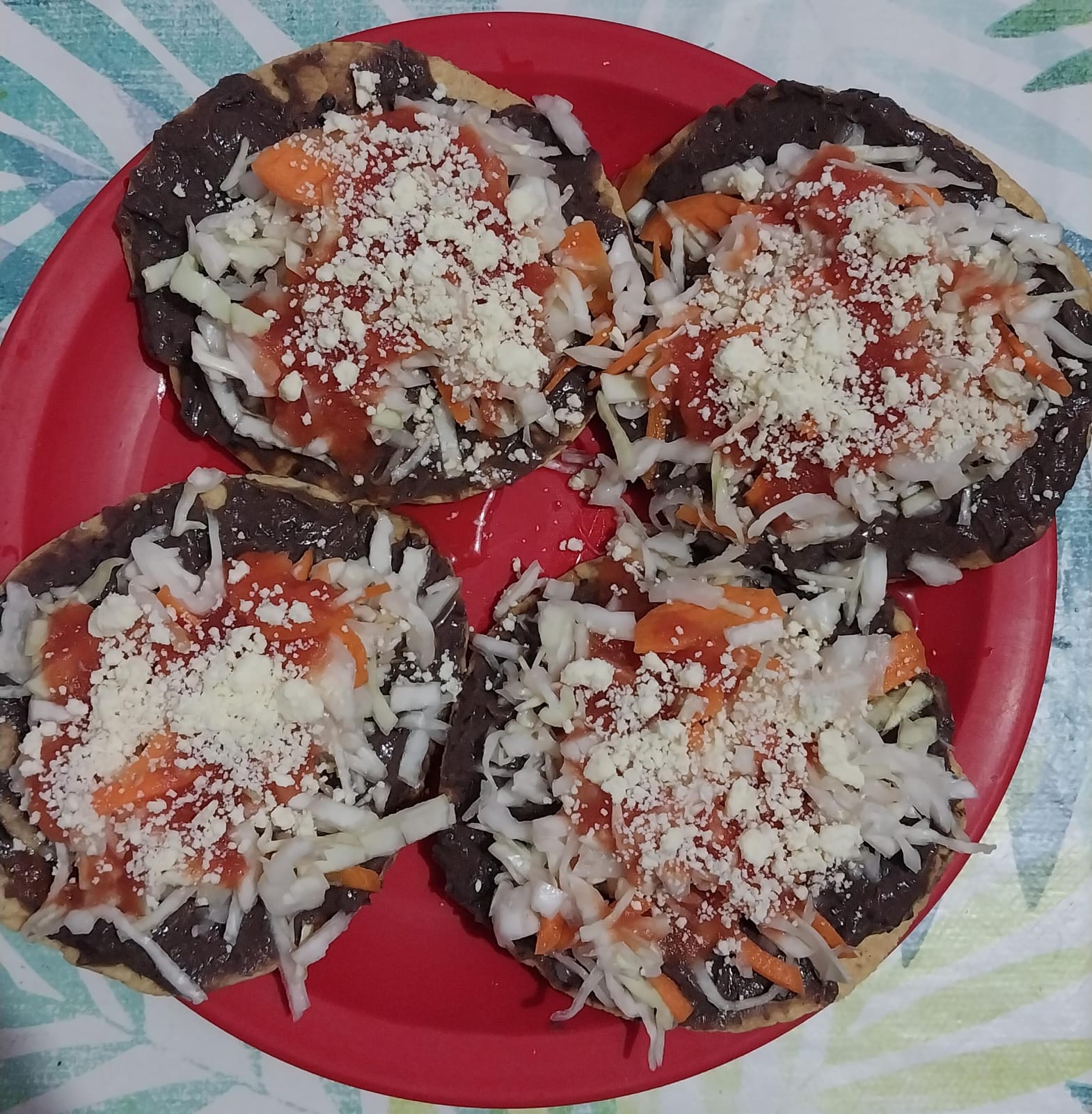 Tortilla frita con frijol refrito, repollo envinagrado, salsa (a elegir con o sin picante) y queso.