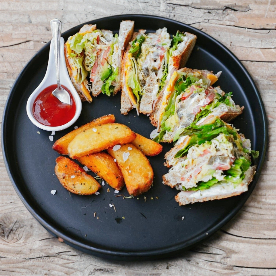 Sándwich de 3 niveles elaborado con pan de caja, pollo deshebrado, jamón, quesillo, aguacate, jitomate, lechuga fresca, rodajas de jalapeño y acompañado de 100 gramos de papas a la francesa.