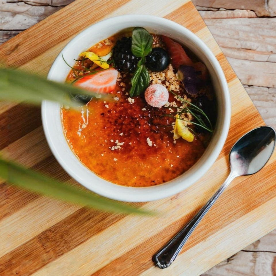 Nuestra version de un clasico de la reposteria francesa, crema con toque de zacate limon, azucar caramelizada y frutos del bosque